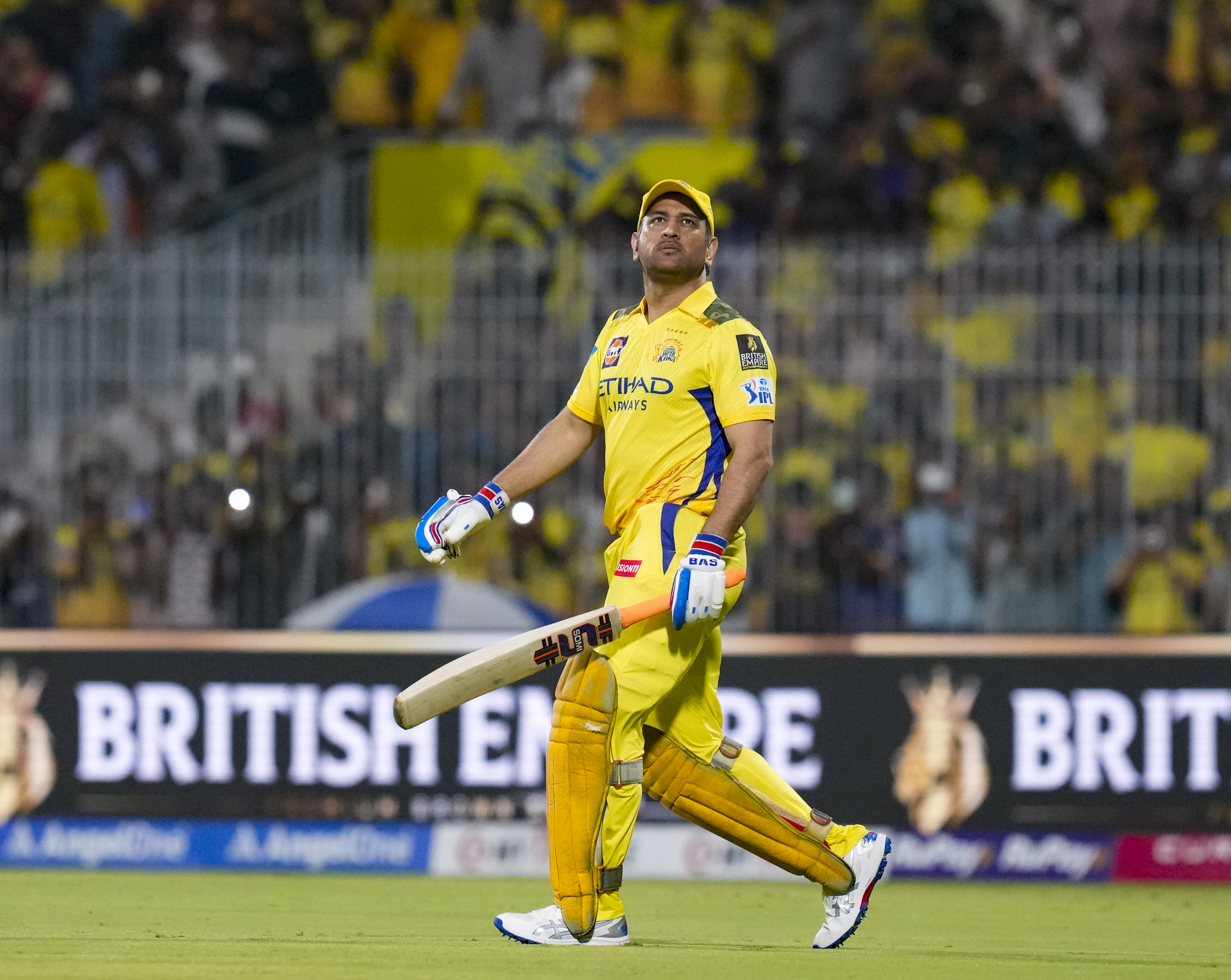 Chennai: Chennai Super Kings’ captain MS Dhoni arrives to bat during an Indian Premier League (IPL) 2025 T20 cricket match between Chennai Super Kings and Kolkata Knight Riders, at the MA Chidambaram Stadium, in Chennai, Friday, April 11, 2025. (PTI Photo/R Senthilkumar) (PTI04_11_2025_000503B) *** Local Caption ***