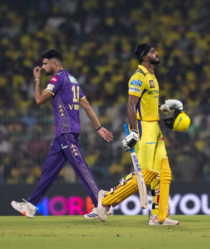 Chennai: Chennai Super Kings’ Vijay Shankar returns to pavilion after his dismissal by Kolkata Knight Riders’ Varun Chakravarthy during an Indian Premier League (IPL) 2025 T20 cricket match between Chennai Super Kings and Kolkata Knight Riders, at the MA Chidambaram Stadium, in Chennai, Friday, April 11, 2025. (PTI Photo/R Senthilkumar) (PTI04_11_2025_000474B) *** Local Caption ***