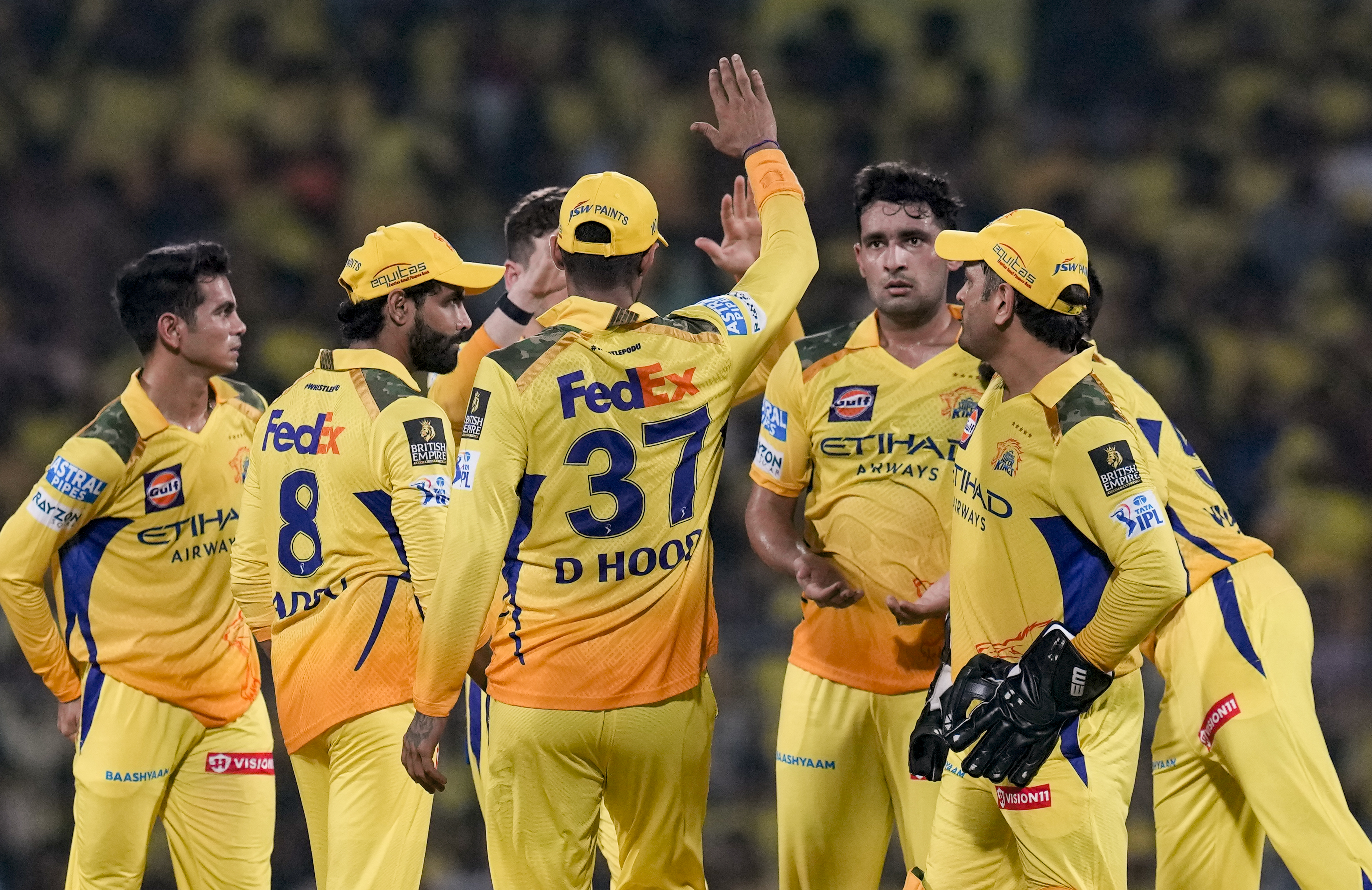 Chennai: Chennai Super Kings� Anshul Kamboj celebrates with teammates after taking the wicket of Kolkata Knight Riders’ Quinton de Kock during an Indian Premier League (IPL) 2025 T20 cricket match between Chennai Super Kings and Kolkata Knight Riders, at the MA Chidambaram Stadium, in Chennai, Friday, April 11, 2025. (PTI Photo/R Senthilkumar) (PTI04_11_2025_000561B) *** Local Caption ***