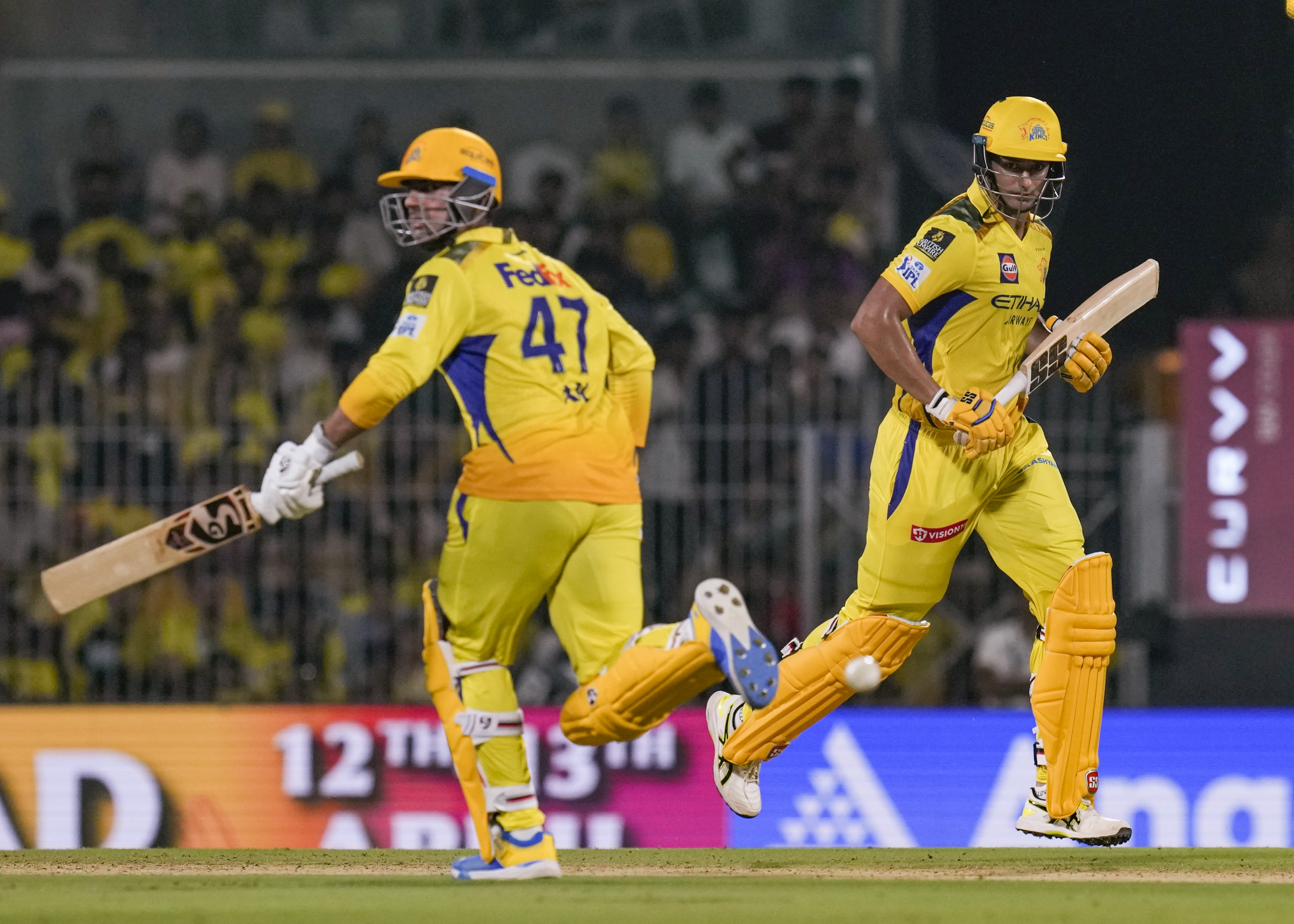 Chennai: Chennai Super Kings� Shivam Dube and Anshul Kamboj run between the wickets during an Indian Premier League (IPL) 2025 T20 cricket match between Chennai Super Kings and Kolkata Knight Riders, at the MA Chidambaram Stadium, in Chennai, Friday, April 11, 2025. (PTI Photo/R Senthilkumar) (PTI04_11_2025_000525B) *** Local Caption ***