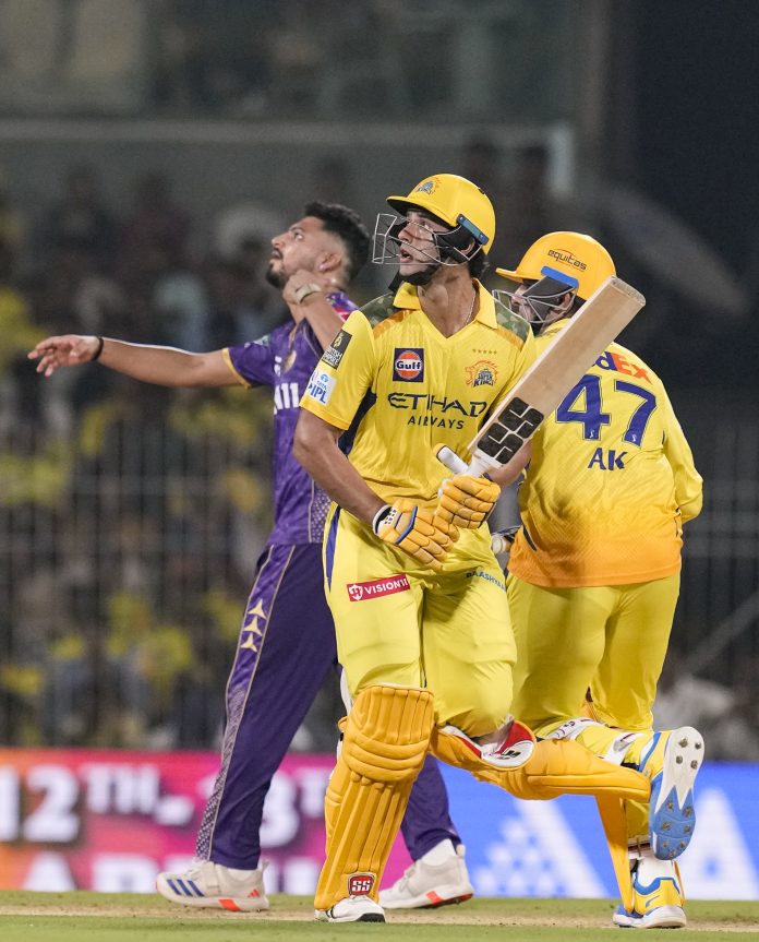 Chennai: Chennai Super Kings’ Shivam Dube and Anshul Kamboj run between the wickets during an Indian Premier League (IPL) 2025 T20 cricket match between Chennai Super Kings and Kolkata Knight Riders, at the MA Chidambaram Stadium, in Chennai, Friday, April 11, 2025. (PTI Photo/R Senthilkumar) (PTI04_11_2025_000528B) *** Local Caption ***