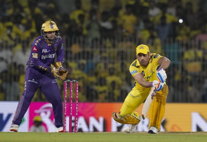Chennai: Chennai Super Kings’ captain MS Dhoni plays a shot during an Indian Premier League (IPL) 2025 T20 cricket match between Chennai Super Kings and Kolkata Knight Riders, at the MA Chidambaram Stadium, in Chennai, Friday, April 11, 2025. (PTI Photo/R Senthilkumar) (PTI04_11_2025_000519B) *** Local Caption ***