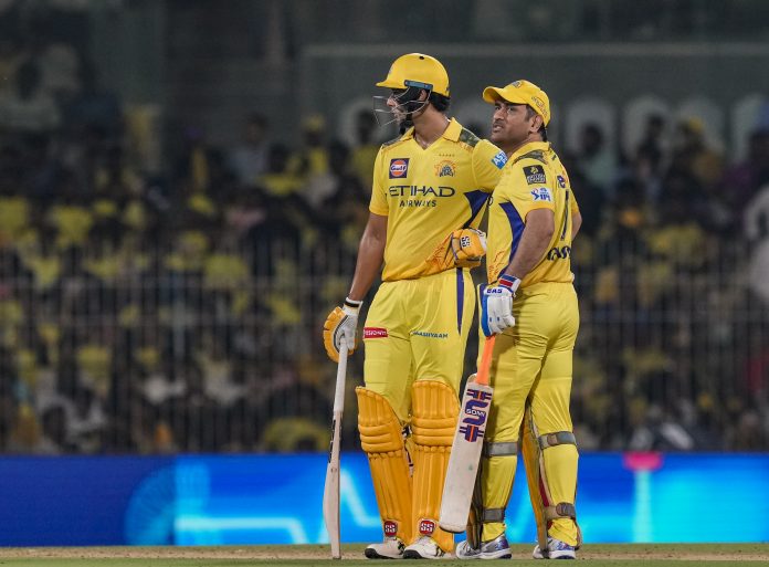 Chennai: Chennai Super Kings’ captain MS Dhoni and Shivam Dube wait for third umpire�s decision amid a DRS review during an Indian Premier League (IPL) 2025 T20 cricket match between Chennai Super Kings and Kolkata Knight Riders, at the MA Chidambaram Stadium, in Chennai, Friday, April 11, 2025. (PTI Photo/R Senthilkumar) (PTI04_11_2025_000520B) *** Local Caption ***
