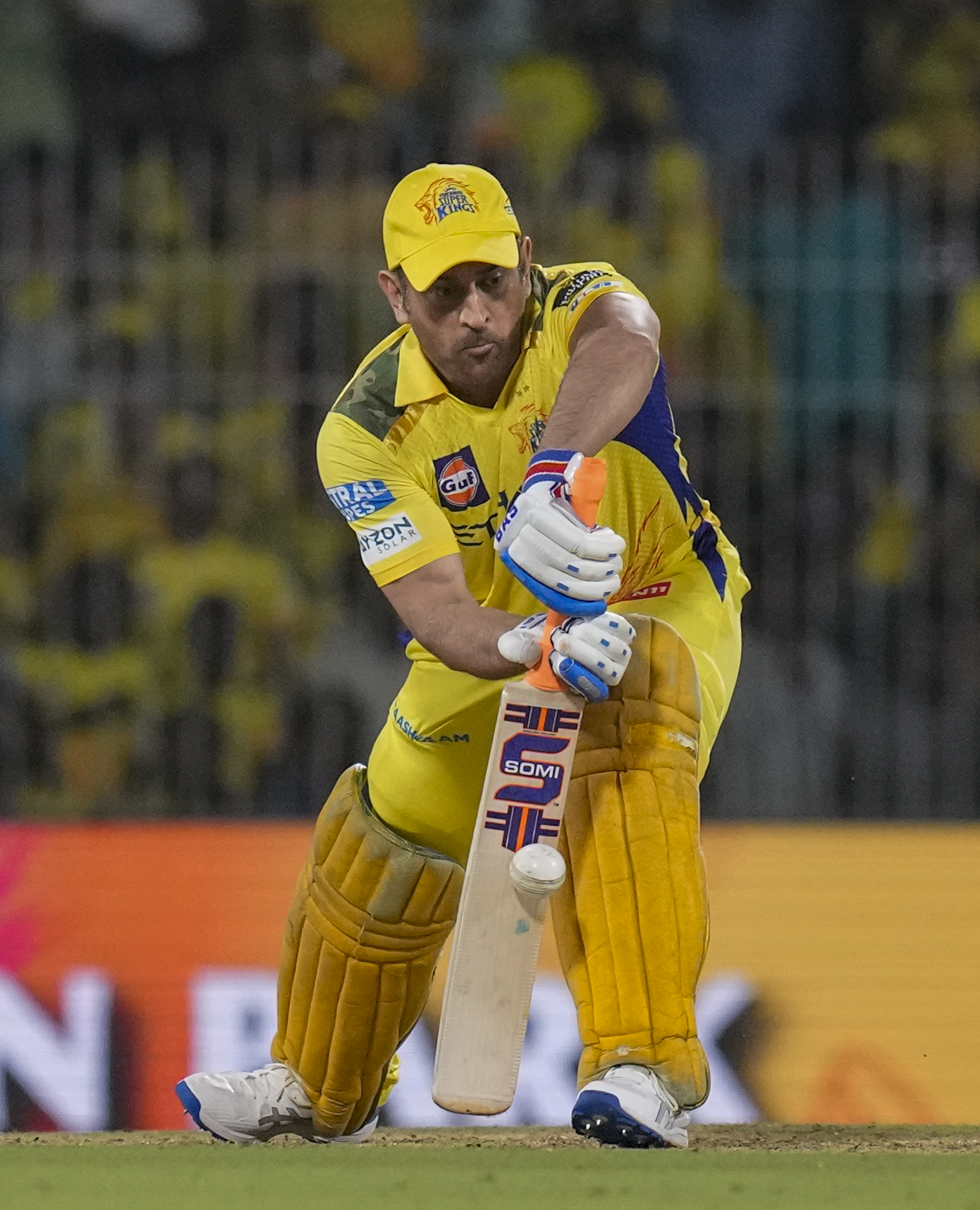 Chennai: Chennai Super Kings’ captain MS Dhoni plays a shot during an Indian Premier League (IPL) 2025 T20 cricket match between Chennai Super Kings and Kolkata Knight Riders, at the MA Chidambaram Stadium, in Chennai, Friday, April 11, 2025. (PTI Photo/R Senthilkumar) (PTI04_11_2025_000521B) *** Local Caption ***