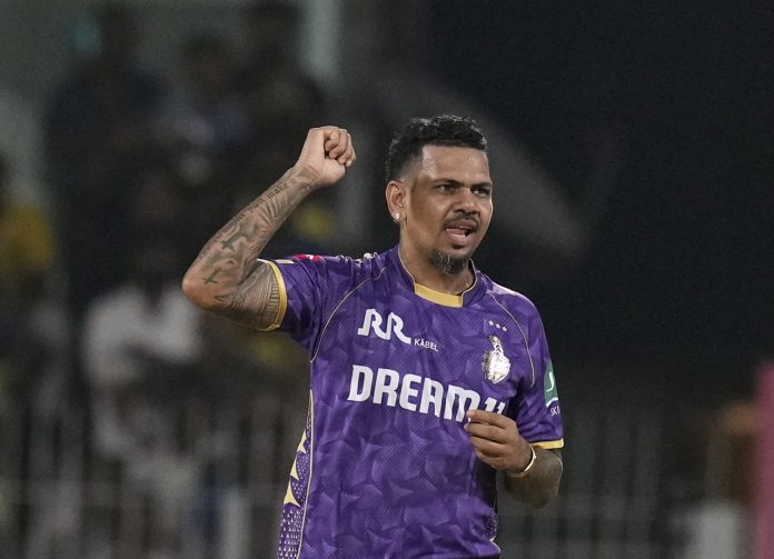 Chennai: Kolkata Knight Riders� Sunil Narine celebrates the wicket of Chennai Super Kings’ Deepak Hooda during an Indian Premier League (IPL) 2025 T20 cricket match between Chennai Super Kings and Kolkata Knight Riders, at the MA Chidambaram Stadium, in Chennai, Friday, April 11, 2025. (PTI Photo/R Senthilkumar) (PTI04_11_2025_000510B) *** Local Caption ***