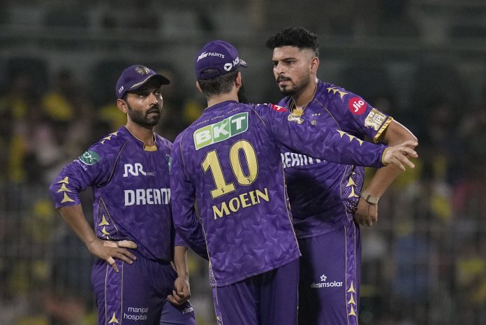 Chennai: Kolkata Knight Riders� Vaibhav Arora celebrates with teammates after taking the wicket of Chennai Super Kings’ Noor Ahmad during an Indian Premier League (IPL) 2025 T20 cricket match between Chennai Super Kings and Kolkata Knight Riders, at the MA Chidambaram Stadium, in Chennai, Friday, April 11, 2025. (PTI Photo/R Senthilkumar) (PTI04_11_2025_000507B) *** Local Caption ***