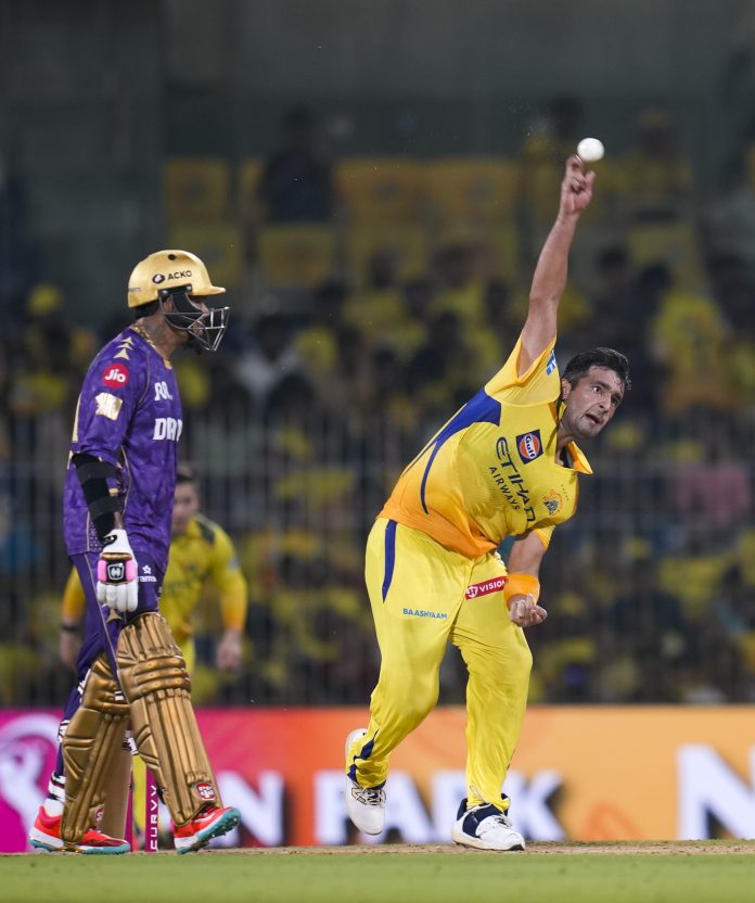 Chennai: Chennai Super Kings’ Anshul Kamboj bowls a delivery during an Indian Premier League (IPL) 2025 T20 cricket match between Chennai Super Kings and Kolkata Knight Riders, at the MA Chidambaram Stadium, in Chennai, Friday, April 11, 2025. (PTI Photo/R Senthilkumar) (PTI04_11_2025_000603B) *** Local Caption ***