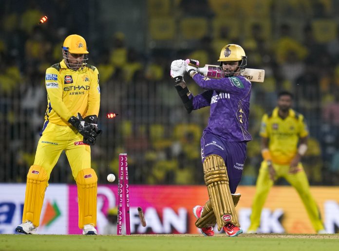 Chennai: Kolkata Knight Riders’ Sunil Narine being bowled by Chennai Super Kings� Noor Ahmad during an Indian Premier League (IPL) 2025 T20 cricket match between Chennai Super Kings and Kolkata Knight Riders, at the MA Chidambaram Stadium, in Chennai, Friday, April 11, 2025. (PTI Photo/R Senthilkumar) (PTI04_11_2025_000601B) *** Local Caption ***
