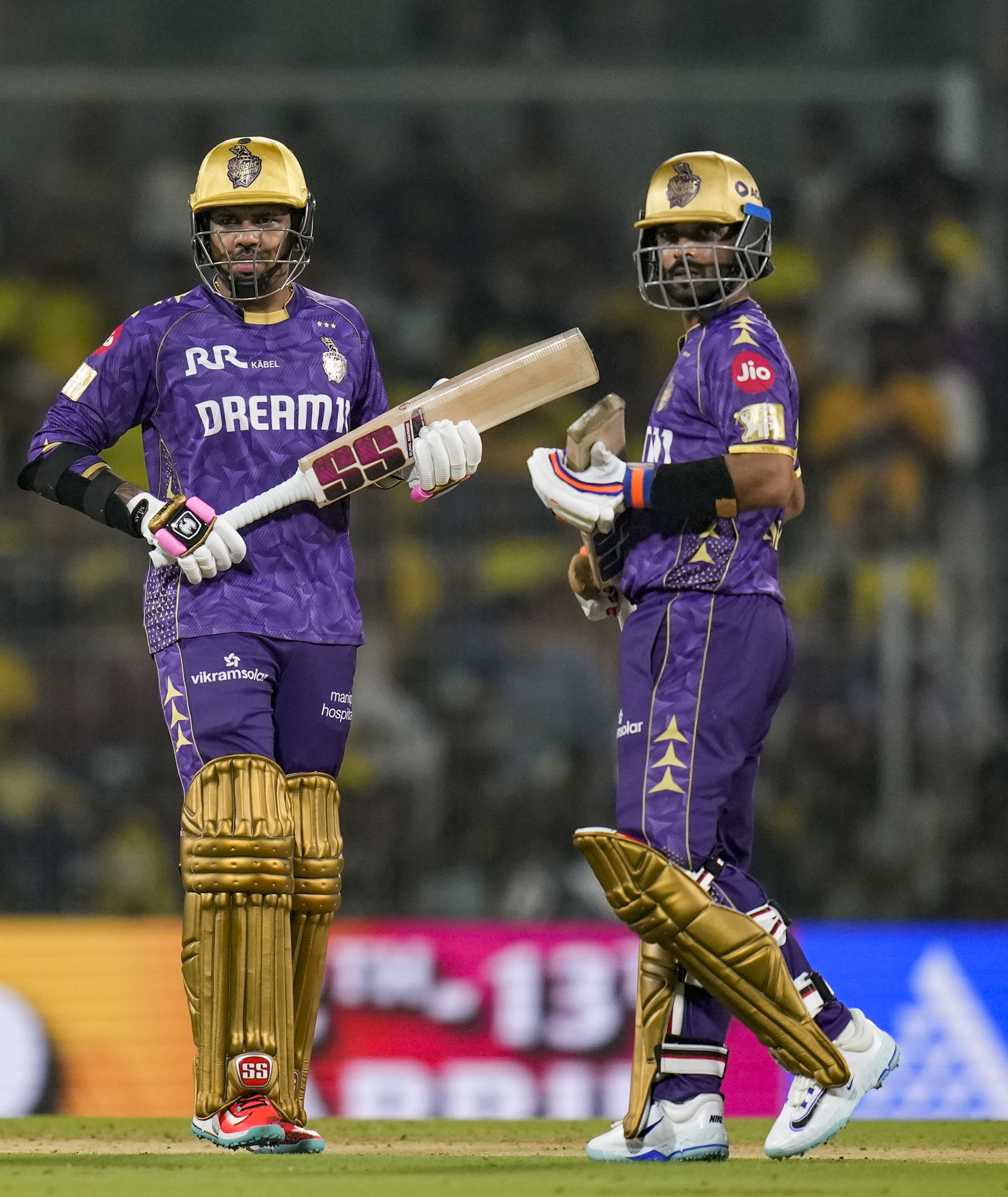 Chennai: Kolkata Knight Riders’ captain Ajinkya Rahane and Sunil Narine during an Indian Premier League (IPL) 2025 T20 cricket match between Chennai Super Kings and Kolkata Knight Riders, at the MA Chidambaram Stadium, in Chennai, Friday, April 11, 2025. (PTI Photo/R Senthilkumar) (PTI04_11_2025_000591B) *** Local Caption ***