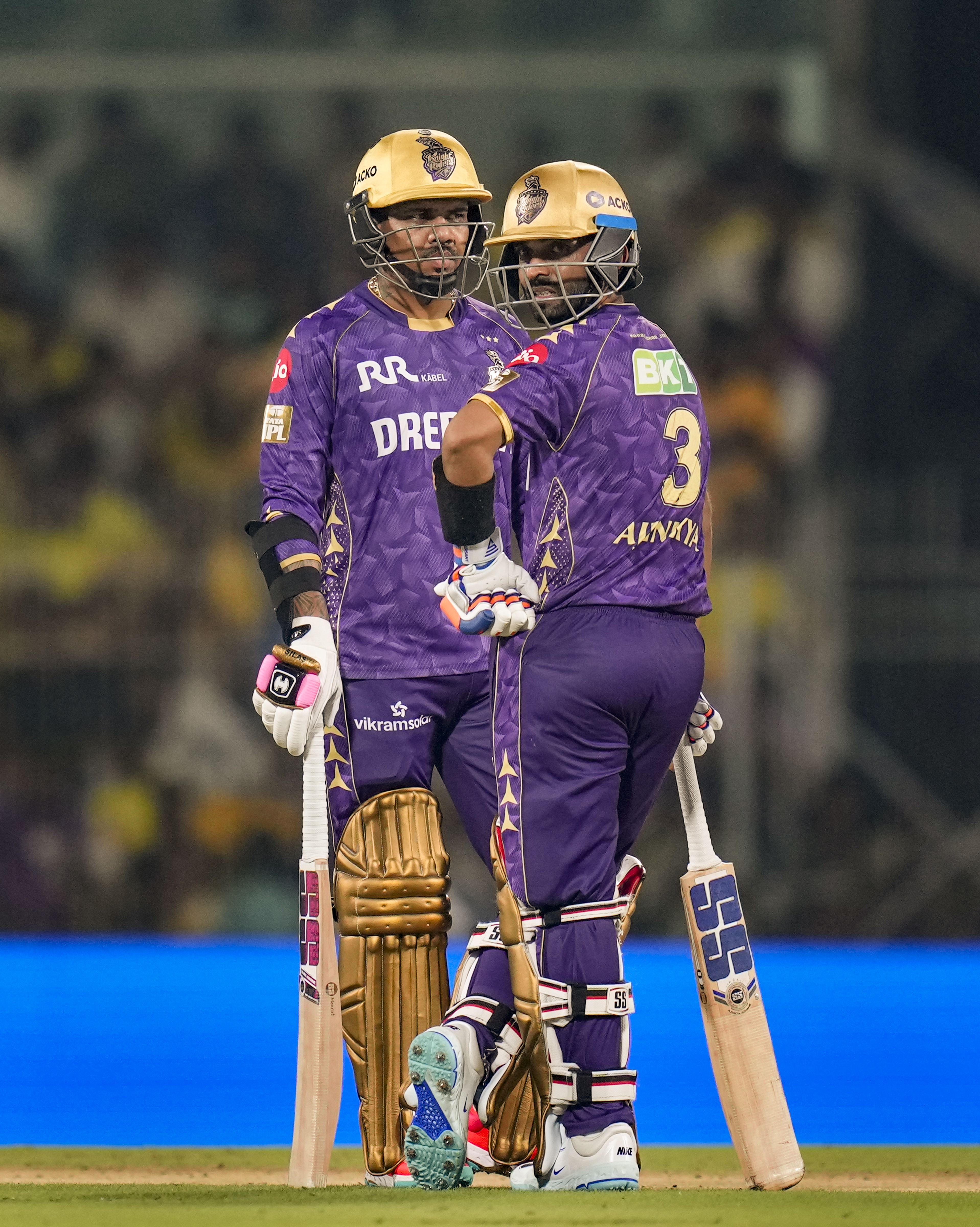 Chennai: Kolkata Knight Riders’ captain Ajinkya Rahane and Sunil Narine during an Indian Premier League (IPL) 2025 T20 cricket match between Chennai Super Kings and Kolkata Knight Riders, at the MA Chidambaram Stadium, in Chennai, Friday, April 11, 2025. (PTI Photo/R Senthilkumar) (PTI04_11_2025_000586B) *** Local Caption ***