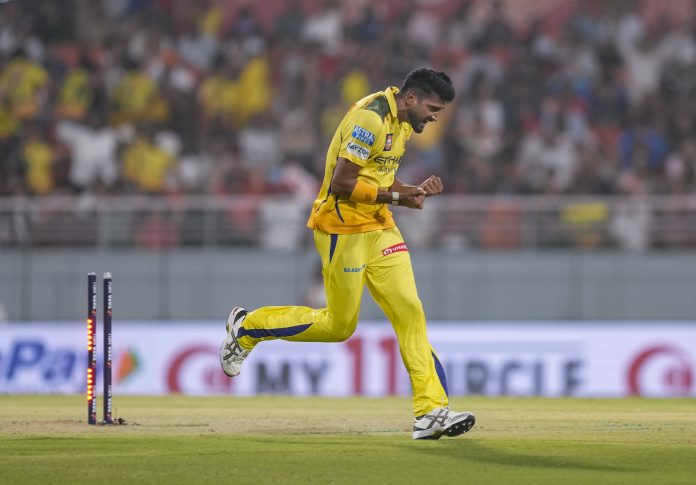 New Chandigarh: Chennai Super Kings’ Khaleel Ahmed celebrates the wicket of Punjab Kings’ captain Shreyas Iyer during an Indian Premier League (IPL) 2025 cricket match between Punjab Kings and Chennai Super Kings, in New Chandigarh, Tuesday, April 8, 2025. (PTI Photo/Ravi Choudhary) (PTI04_08_2025_000480B)
