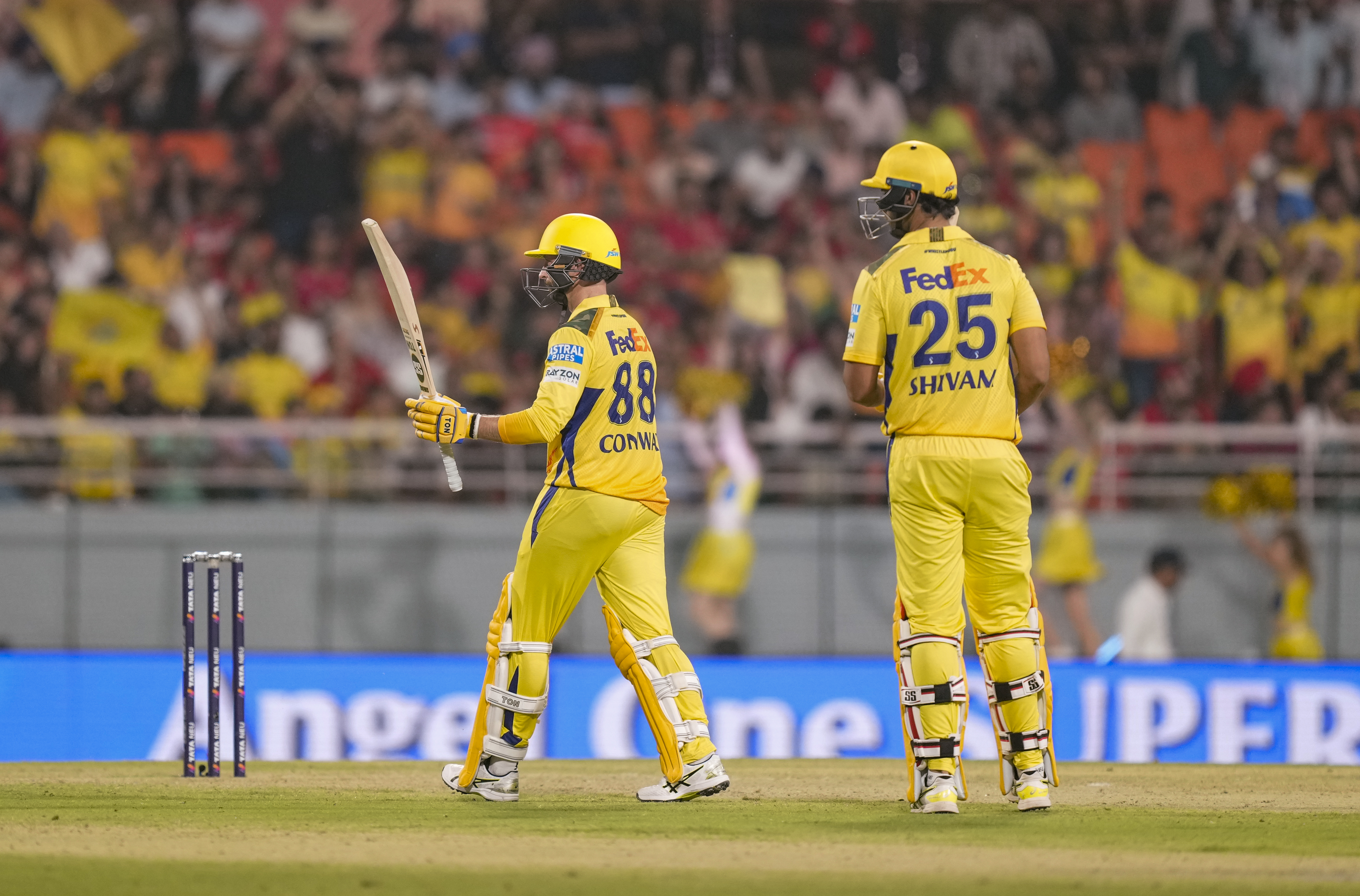 New Chandigarh: Chennai Super Kings’ Devon Conway celebrates his half century during an Indian Premier League (IPL) 2025 cricket match between Punjab Kings and Chennai Super Kings, in New Chandigarh, Tuesday, April 8, 2025. (PTI Photo/Ravi Choudhary) (PTI04_08_2025_000661B)