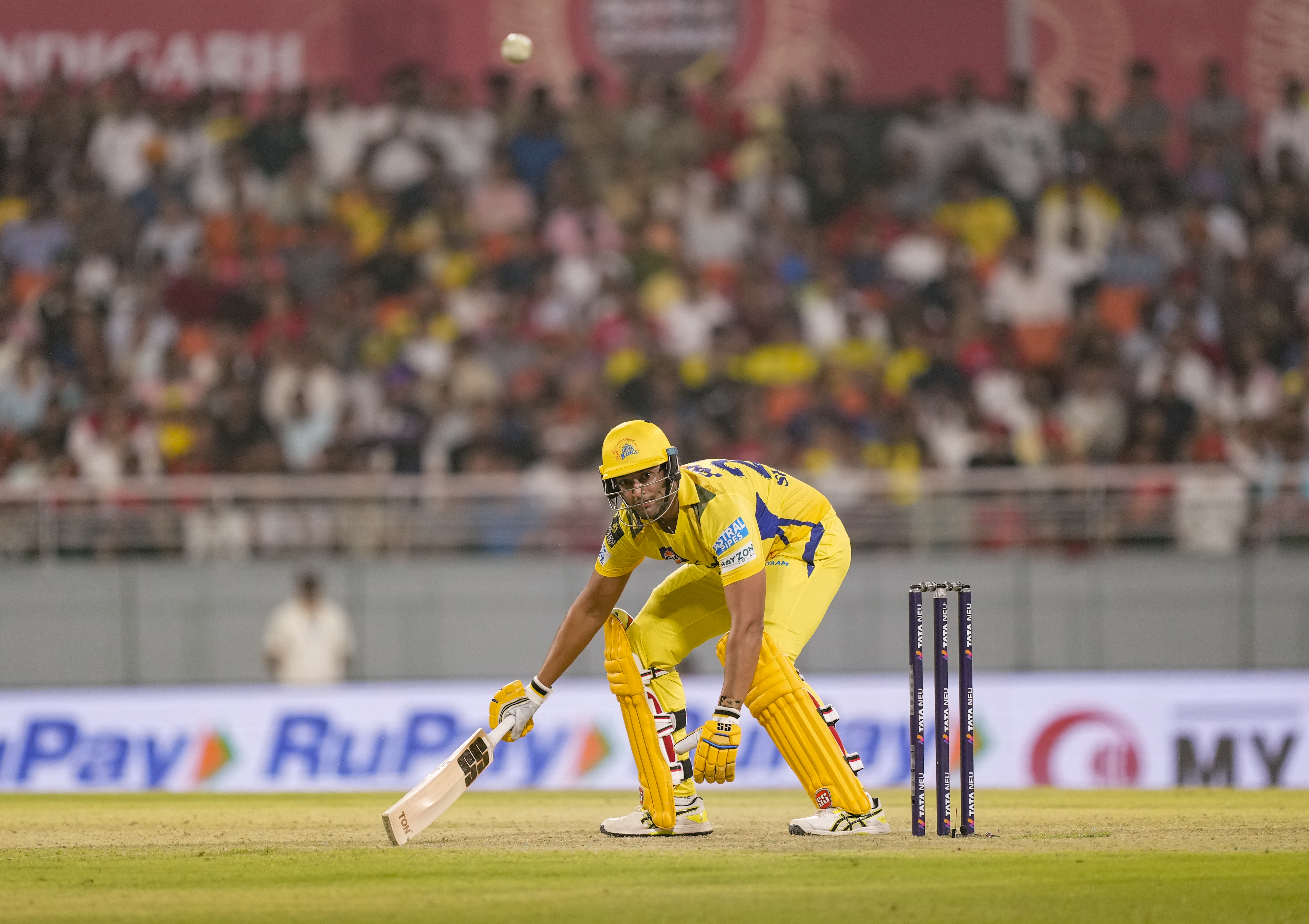 New Chandigarh: Chennai Super Kings' Shivam Dube attempts to take a run during an Indian Premier League (IPL) 2025 cricket match between Punjab Kings and Chennai Super Kings, in New Chandigarh, Tuesday, April 8, 2025. (PTI Photo/Ravi Choudhary) (PTI04_08_2025_000658B)