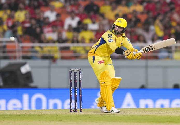 New Chandigarh: Chennai Super Kings’ Devon Conway plays a shot during an Indian Premier League (IPL) 2025 cricket match between Punjab Kings and Chennai Super Kings, in New Chandigarh, Tuesday, April 8, 2025. (PTI Photo/Ravi Choudhary) (PTI04_08_2025_000646B)