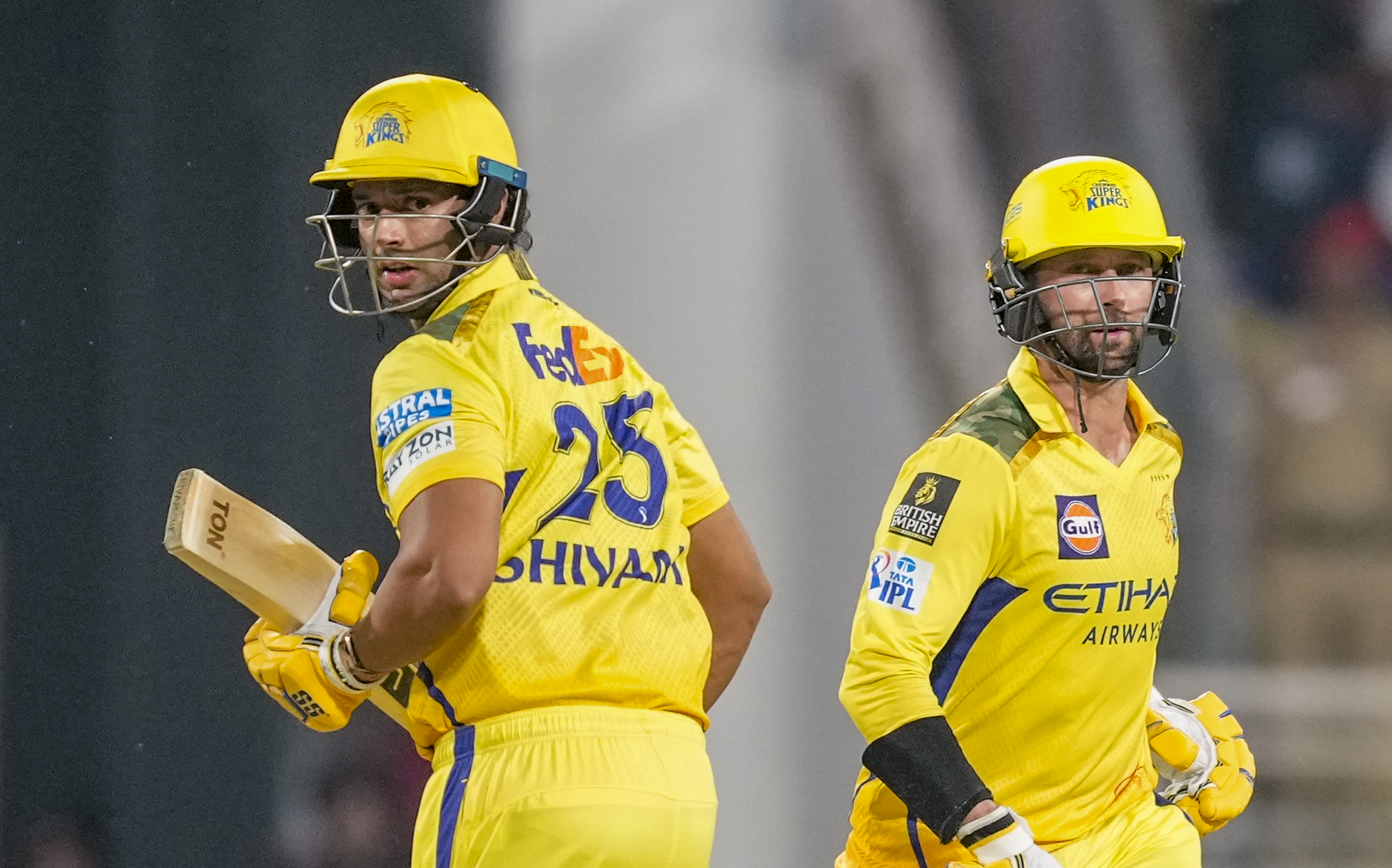 New Chandigarh: Chennai Super Kings’ Shivam Dube and Devon Conway run between the wickets during an Indian Premier League (IPL) 2025 cricket match between Punjab Kings and Chennai Super Kings, in New Chandigarh, Tuesday, April 8, 2025. (PTI Photo/Ravi Choudhary) (PTI04_08_2025_000637B)