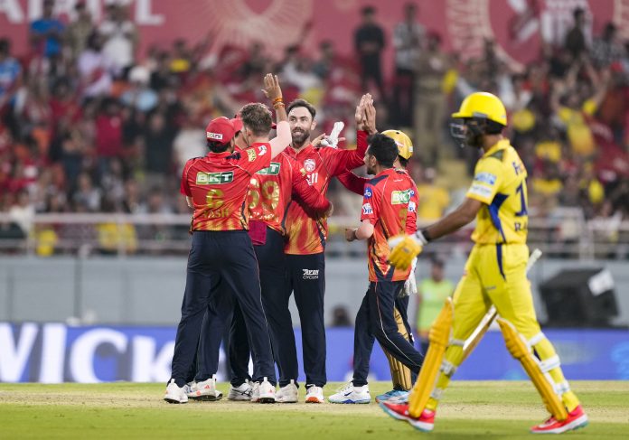 New Chandigarh: Punjab Kings’ Glenn Maxwell with teammates celebrates the wicket of Chennai Super Kings’ Rachin Ravindra during an Indian Premier League (IPL) 2025 cricket match between Punjab Kings and Chennai Super Kings, in New Chandigarh, Tuesday, April 8, 2025. (PTI Photo/Ravi Choudhary) (PTI04_08_2025_000627B)