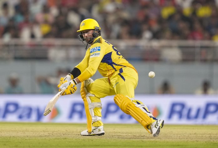 New Chandigarh: Chennai Super Kings’ Devon Conway plays a shot during an Indian Premier League (IPL) 2025 cricket match between Punjab Kings and Chennai Super Kings, in New Chandigarh, Tuesday, April 8, 2025. (PTI Photo/Ravi Choudhary) (PTI04_08_2025_000624B)