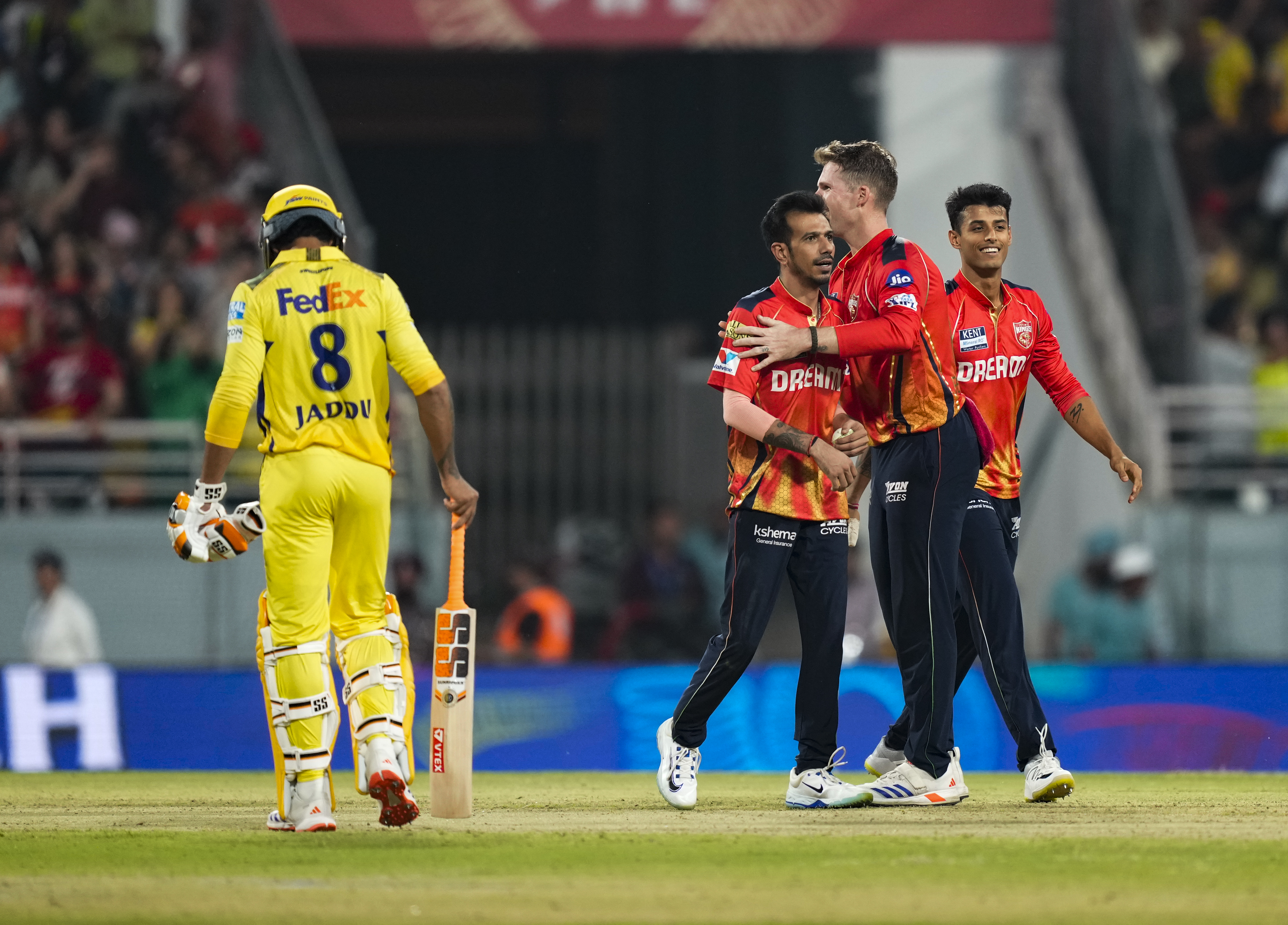New Chandigarh: Punjab Kings’ players celebrate the wicket of Chennai Super Kings’ MS Dhoni during an Indian Premier League (IPL) 2025 cricket match between Punjab Kings and Chennai Super Kings, in New Chandigarh, Tuesday, April 8, 2025. (PTI Photo/Ravi Choudhary) (PTI04_08_2025_000688B)