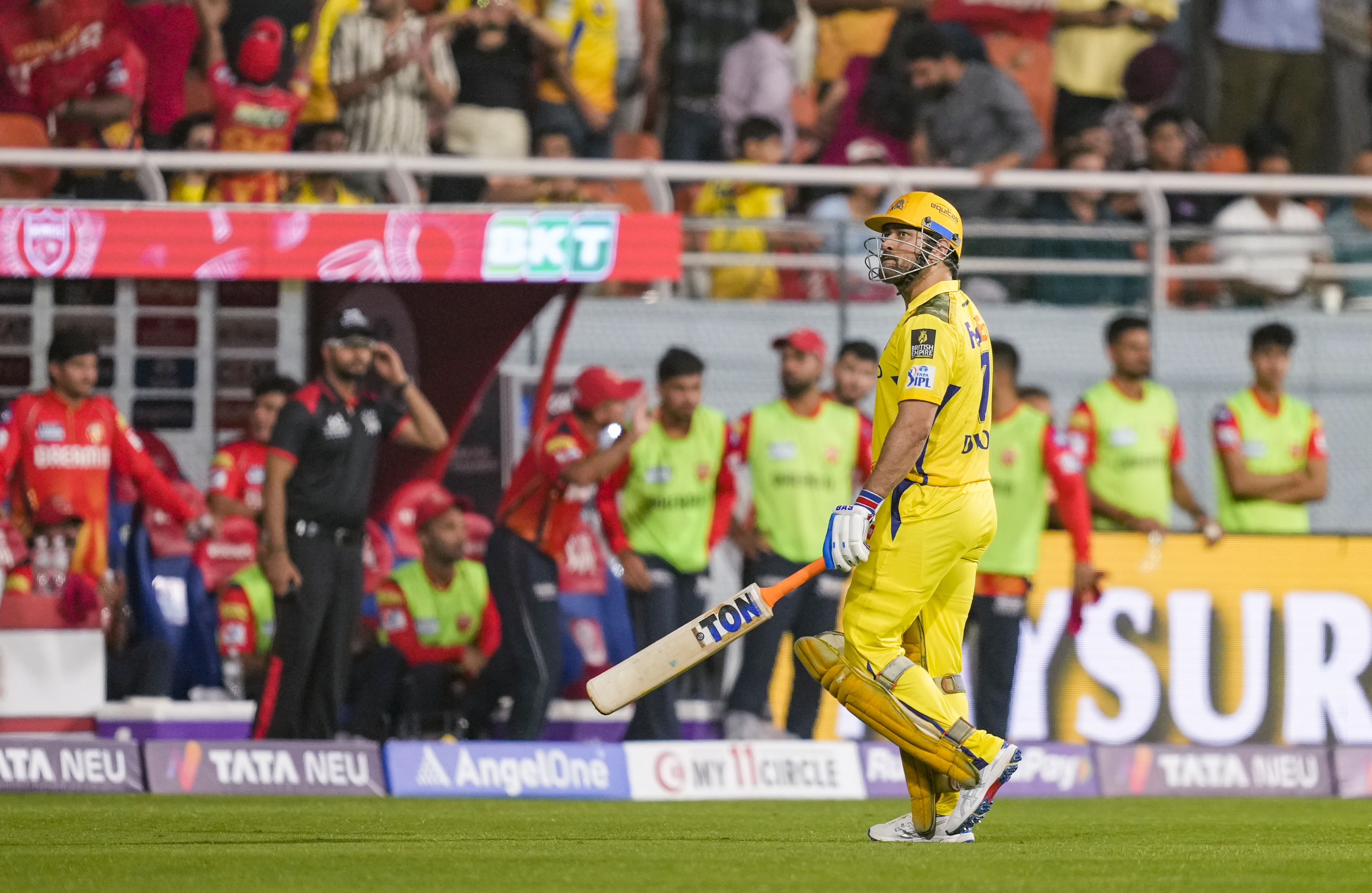 New Chandigarh: Chennai Super Kings’ MS Dhoni walks back after his dismissal during an Indian Premier League (IPL) 2025 cricket match between Punjab Kings and Chennai Super Kings, in New Chandigarh, Tuesday, April 8, 2025. (PTI Photo/Ravi Choudhary) (PTI04_08_2025_000685B)