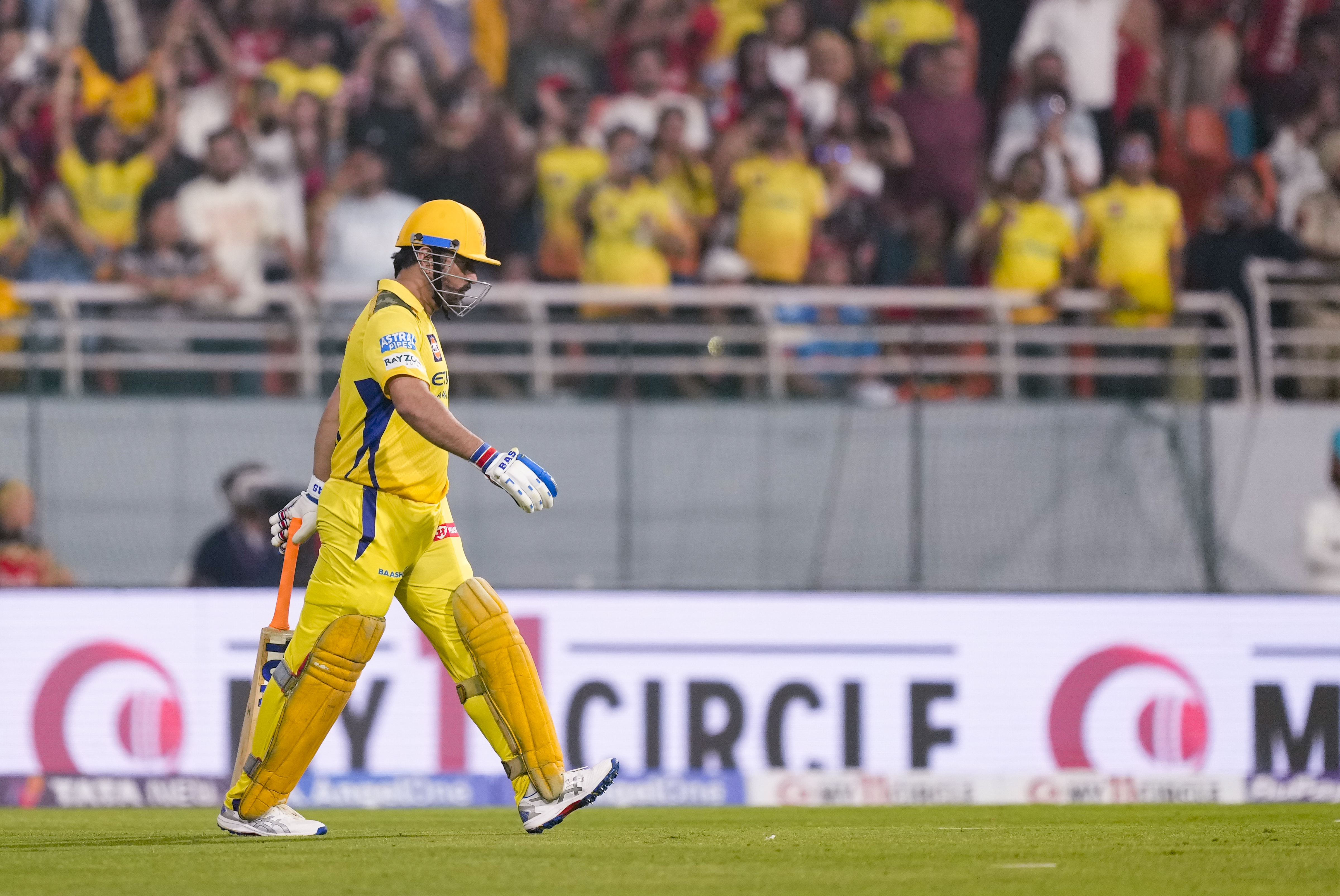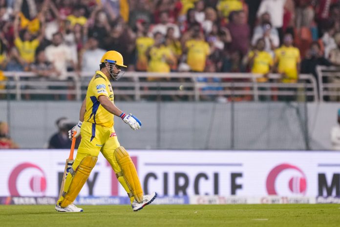 New Chandigarh: Chennai Super Kings’ MS Dhoni walks in the field to bat during an Indian Premier League (IPL) 2025 cricket match between Punjab Kings and Chennai Super Kings, in New Chandigarh, Tuesday, April 8, 2025. (PTI Photo/Ravi Choudhary) (PTI04_08_2025_000670B)