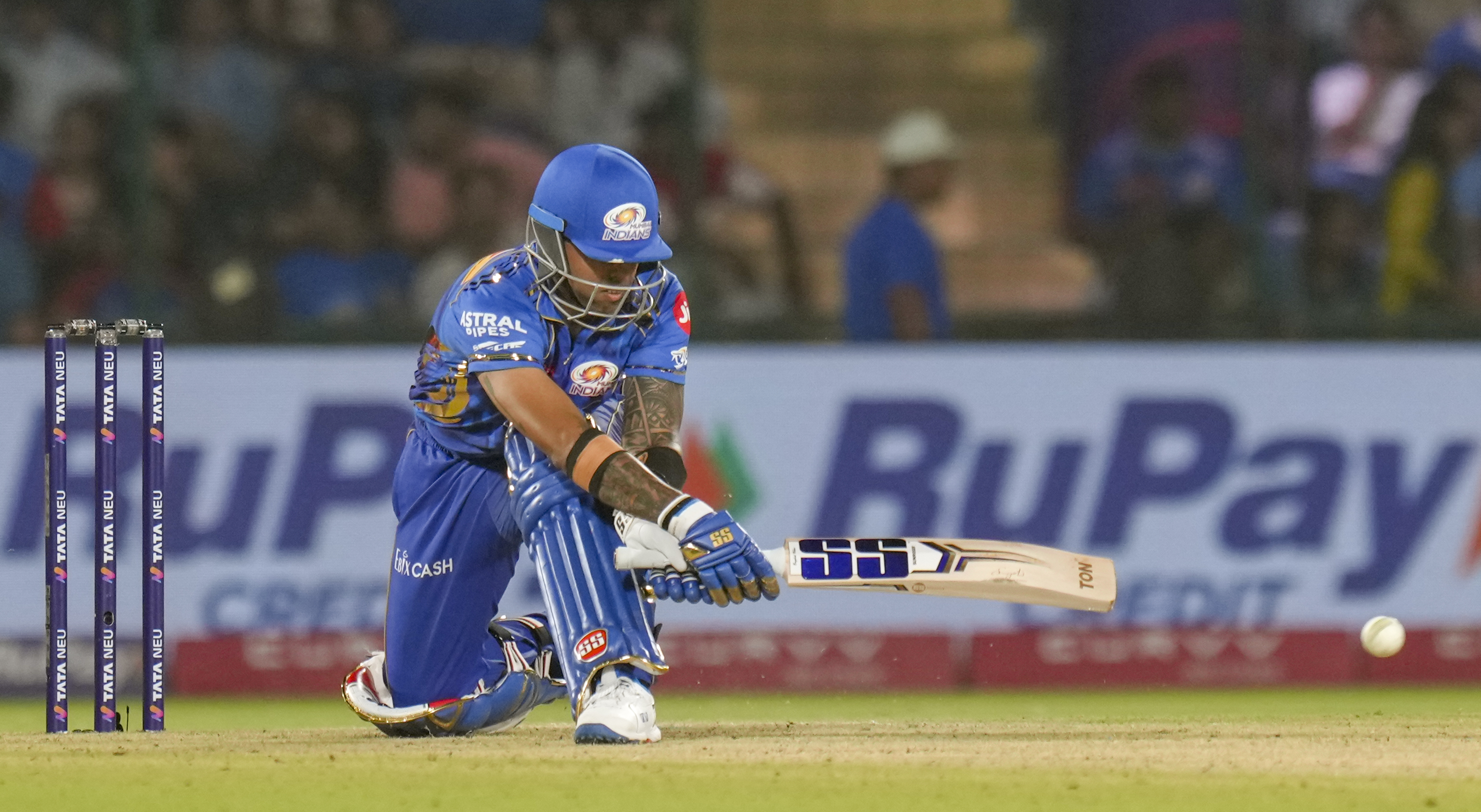 New Delhi: Mumbai Indians’ Suryakumar Yadav plays a shot during an Indian Premier League (IPL) 2025 T20 cricket match between Delhi Capitals and Mumbai Indians, at the Arun Jaitley Stadium, in New Delhi, Sunday, April 13, 2025. (PTI Photo/Shahbaz Khan) (PTI04_13_2025_000384B)