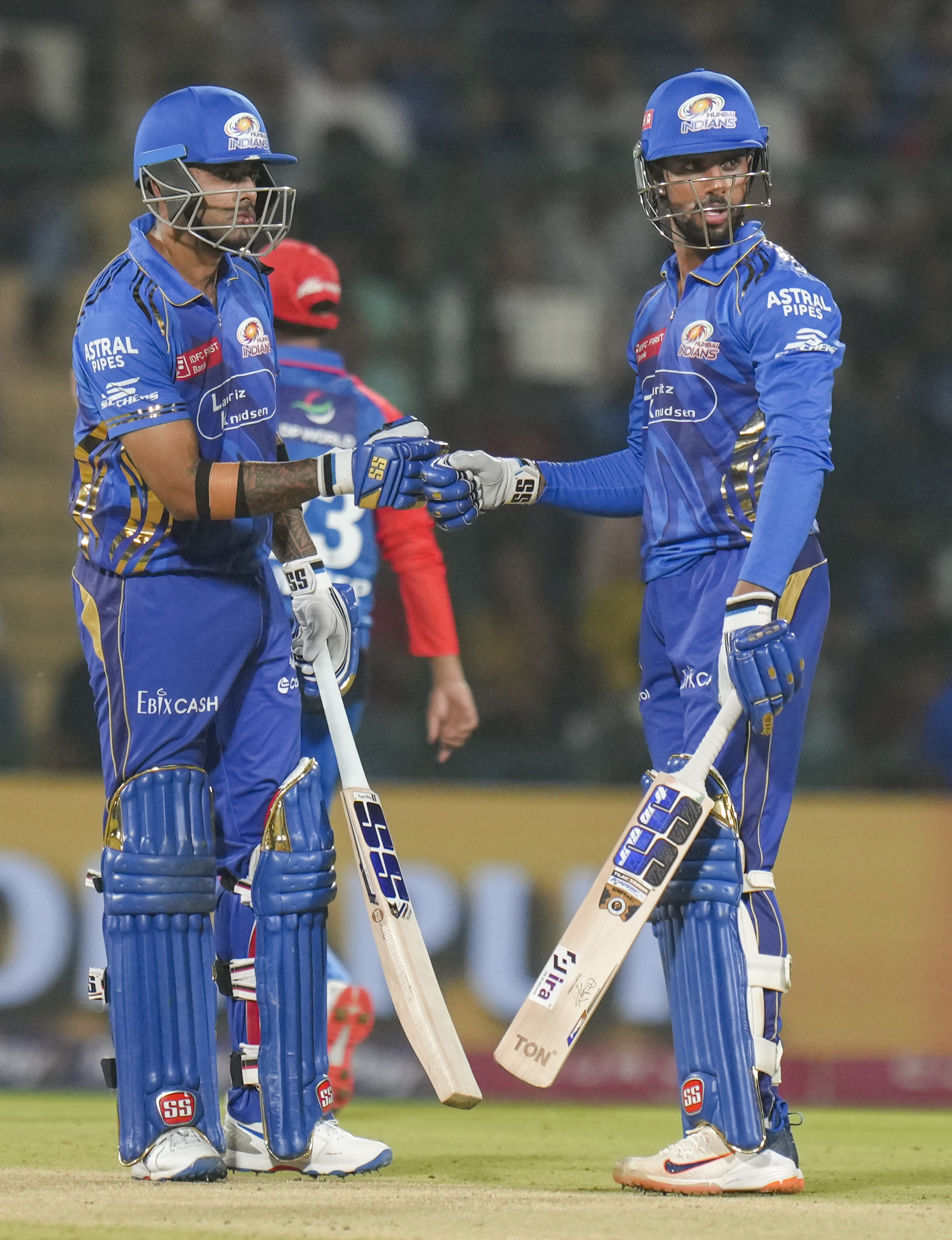 New Delhi: Mumbai Indians’ Suryakumar Yadav and Tilak Varma during an Indian Premier League (IPL) 2025 T20 cricket match between Delhi Capitals and Mumbai Indians, at the Arun Jaitley Stadium, in New Delhi, Sunday, April 13, 2025. (PTI Photo/Shahbaz Khan) (PTI04_13_2025_000380B)