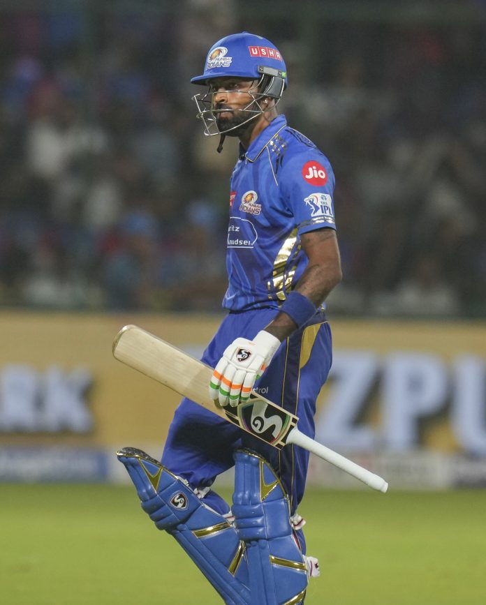 New Delhi: Mumbai Indians’ captain Hardik Pandya returns to pavilion after his dismissal by Delhi Capitals� Vipraj Nigam during an Indian Premier League (IPL) 2025 T20 cricket match between Delhi Capitals and Mumbai Indians, at the Arun Jaitley Stadium, in New Delhi, Sunday, April 13, 2025. (PTI Photo/Shahbaz Khan) (PTI04_13_2025_000409B)