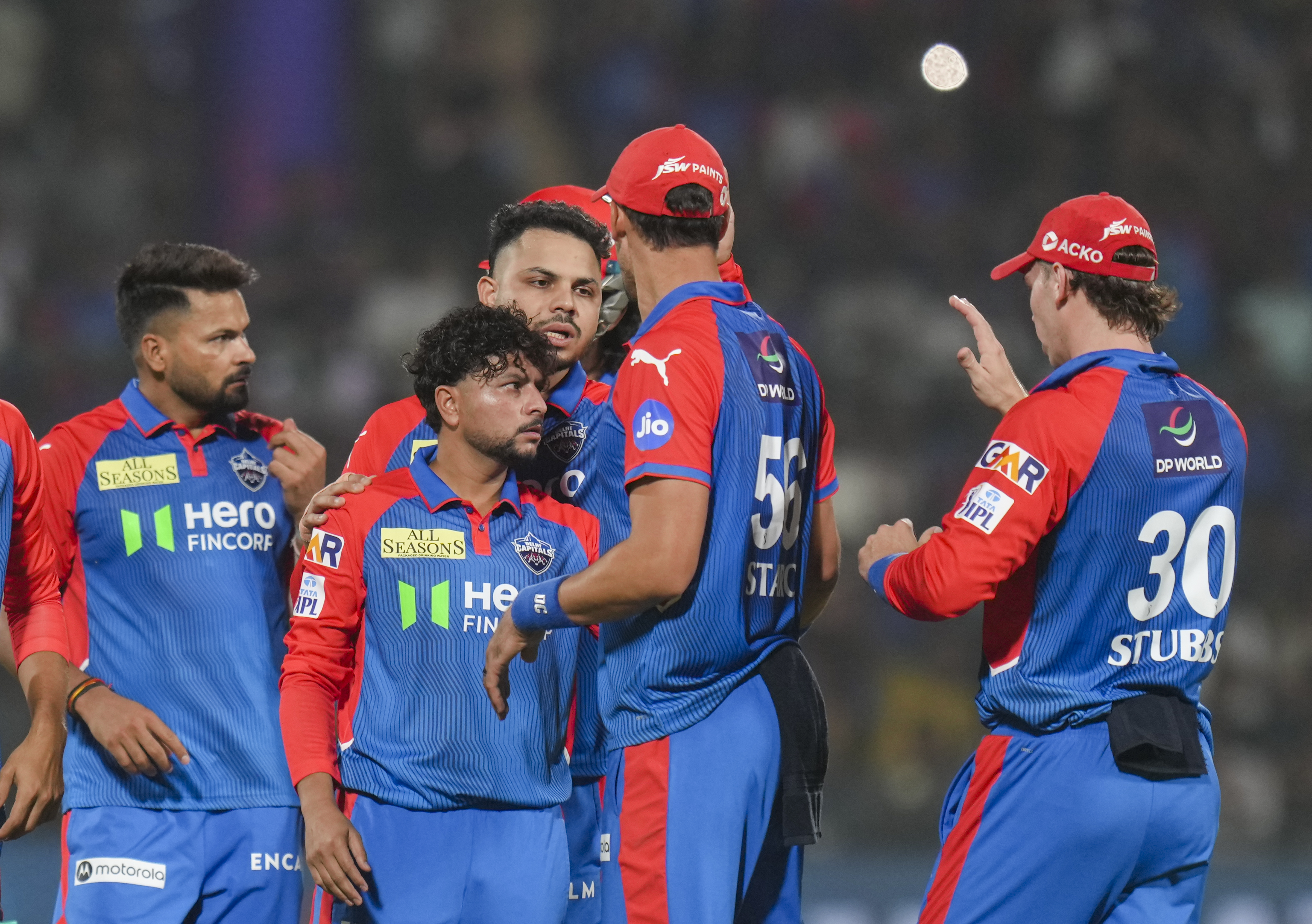 New Delhi: Delhi Capitals� Kuldeep Yadav celebrates with teammates after taking the wicket of Mumbai Indians’ Suryakumar Yadav during an Indian Premier League (IPL) 2025 T20 cricket match between Delhi Capitals and Mumbai Indians, at the Arun Jaitley Stadium, in New Delhi, Sunday, April 13, 2025. (PTI Photo/Shahbaz Khan) (PTI04_13_2025_000400B)