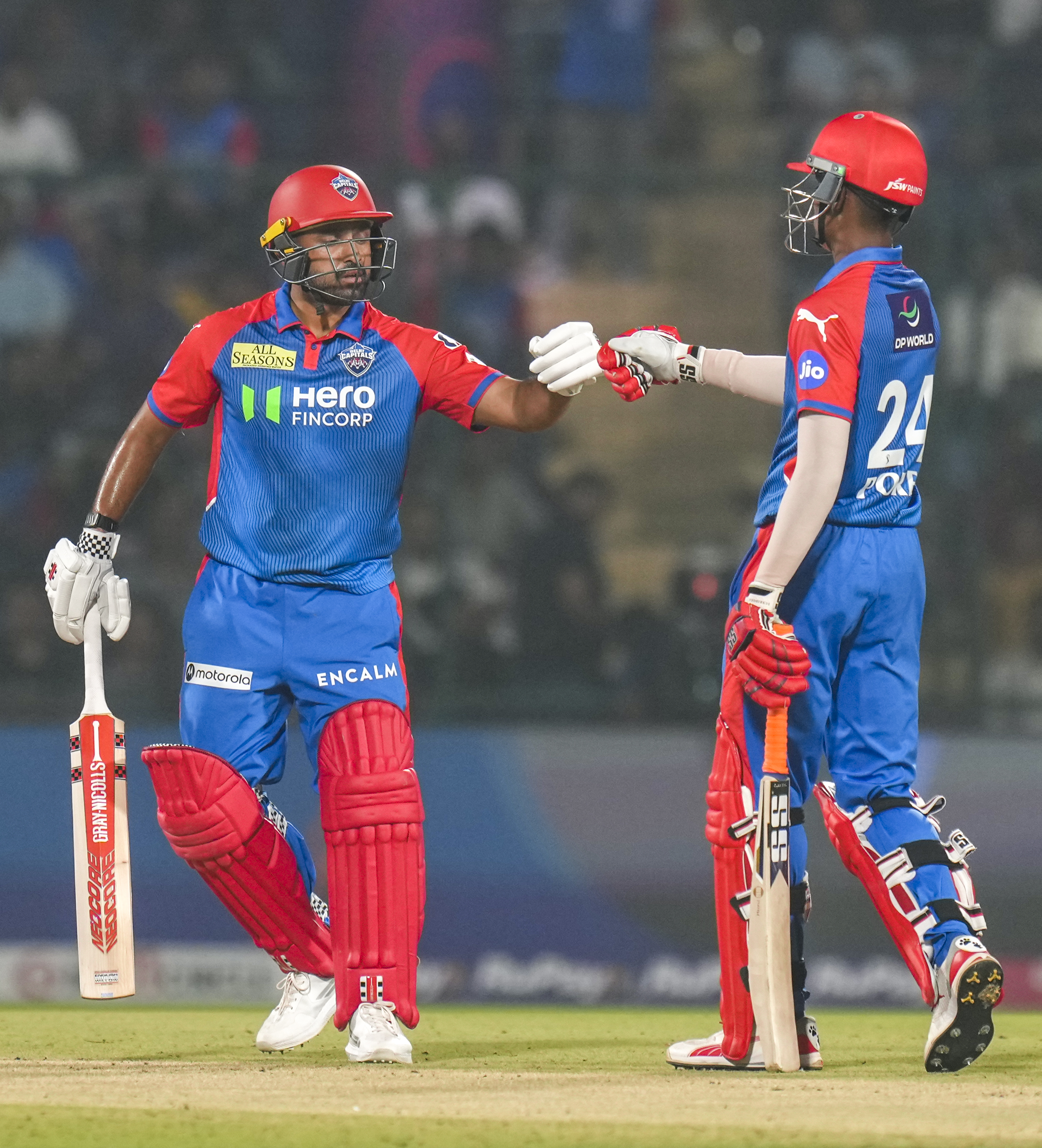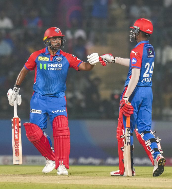 New Delhi: Delhi Capitals’ Abishek Porel and Karun Nair during an Indian Premier League (IPL) 2025 T20 cricket match between Delhi Capitals and Mumbai Indians, at the Arun Jaitley Stadium, in New Delhi, Sunday, April 13, 2025. (PTI Photo/Shahbaz Khan) (PTI04_13_2025_000482B)