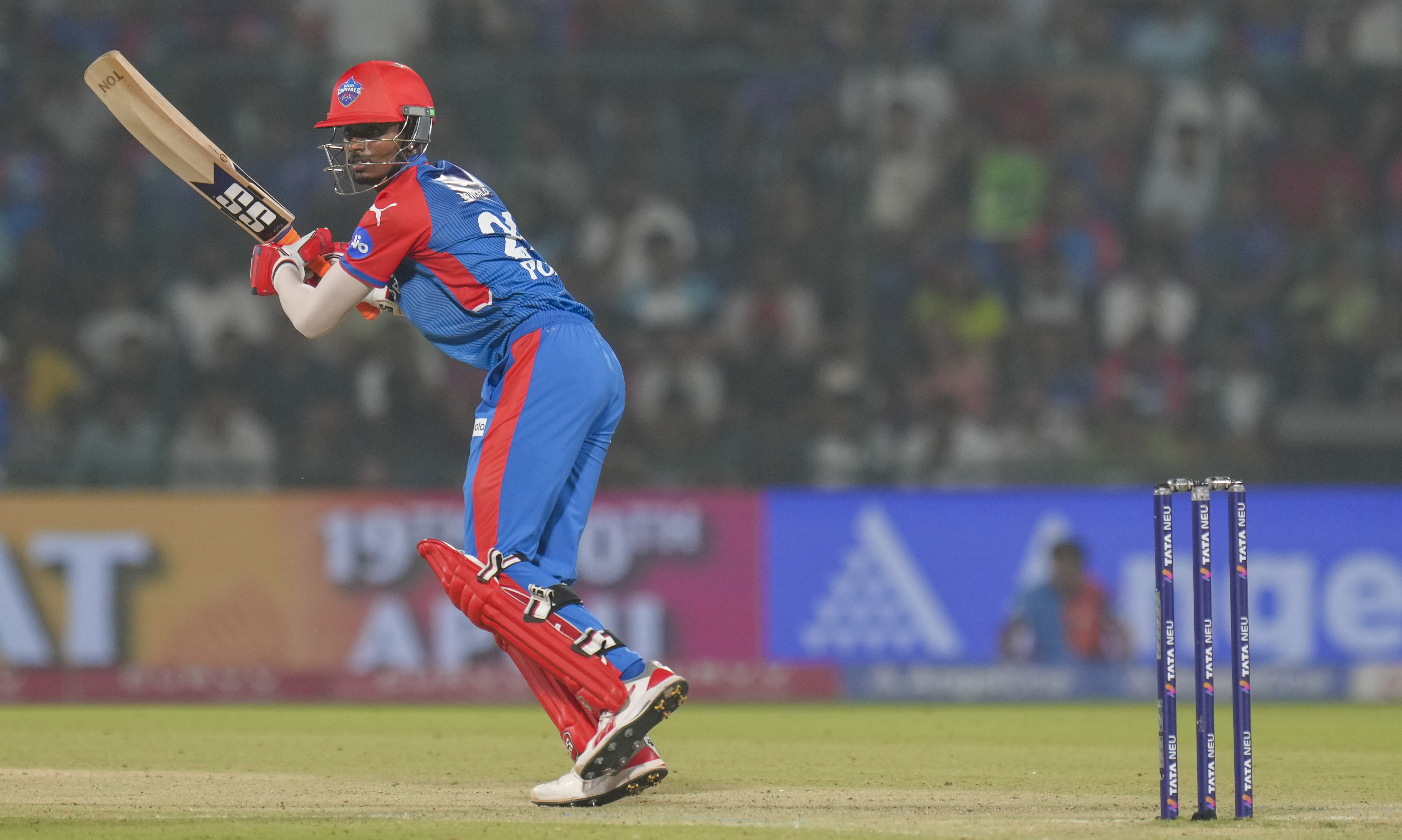 New Delhi: Delhi Capitals' Abishek Porel plays a shot during an Indian Premier League (IPL) 2025 T20 cricket match between Delhi Capitals and Mumbai Indians, at the Arun Jaitley Stadium, in New Delhi, Sunday, April 13, 2025. (PTI Photo/Shahbaz Khan) (PTI04_13_2025_000476B)
