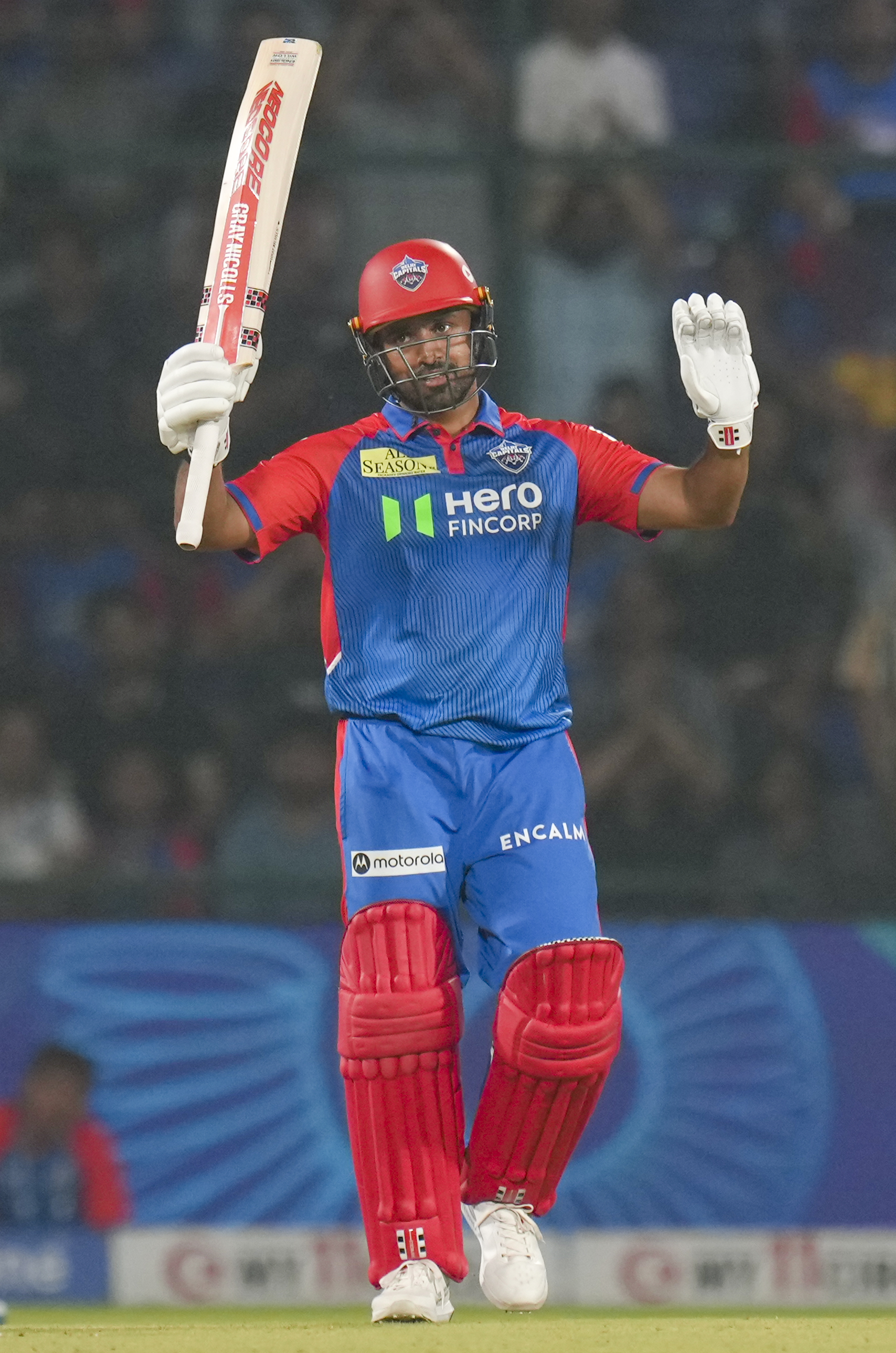 New Delhi: Delhi Capitals' Karun Nair celebrates his half century during an Indian Premier League (IPL) 2025 T20 cricket match between Delhi Capitals and Mumbai Indians, at the Arun Jaitley Stadium, in New Delhi, Sunday, April 13, 2025. (PTI Photo/Shahbaz Khan) (PTI04_13_2025_000477B)