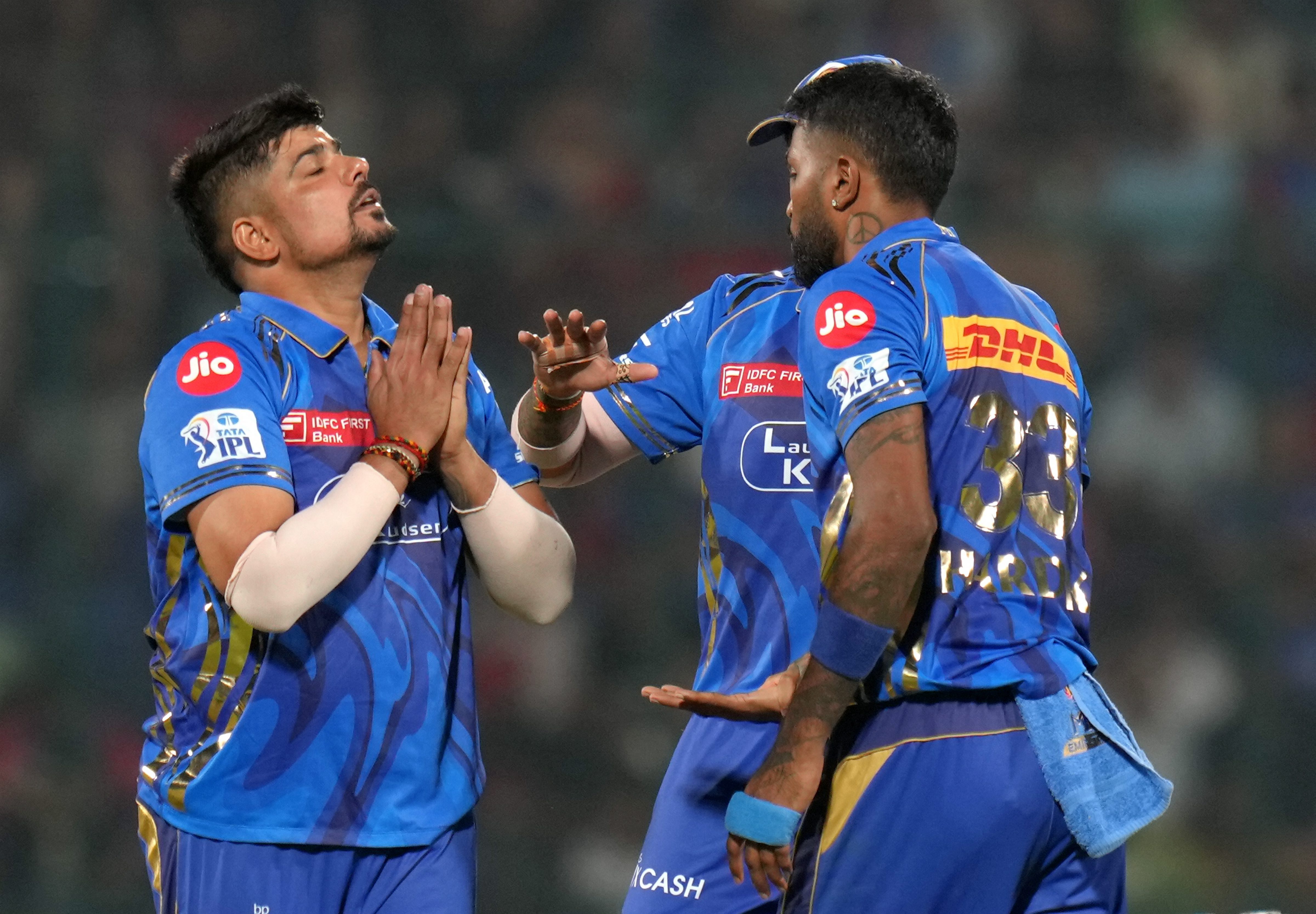 New Delhi: Mumbai Indians' Karn Sharma celebrates with teammates after taking the wicket of Delhi Capitals' Tristan Stubbs during an Indian Premier League (IPL) 2025 T20 cricket match between Delhi Capitals and Mumbai Indians, at the Arun Jaitley Stadium, in New Delhi, Sunday, April 13, 2025. (PTI Photo/Shahbaz Khan) (PTI04_13_2025_000510B)