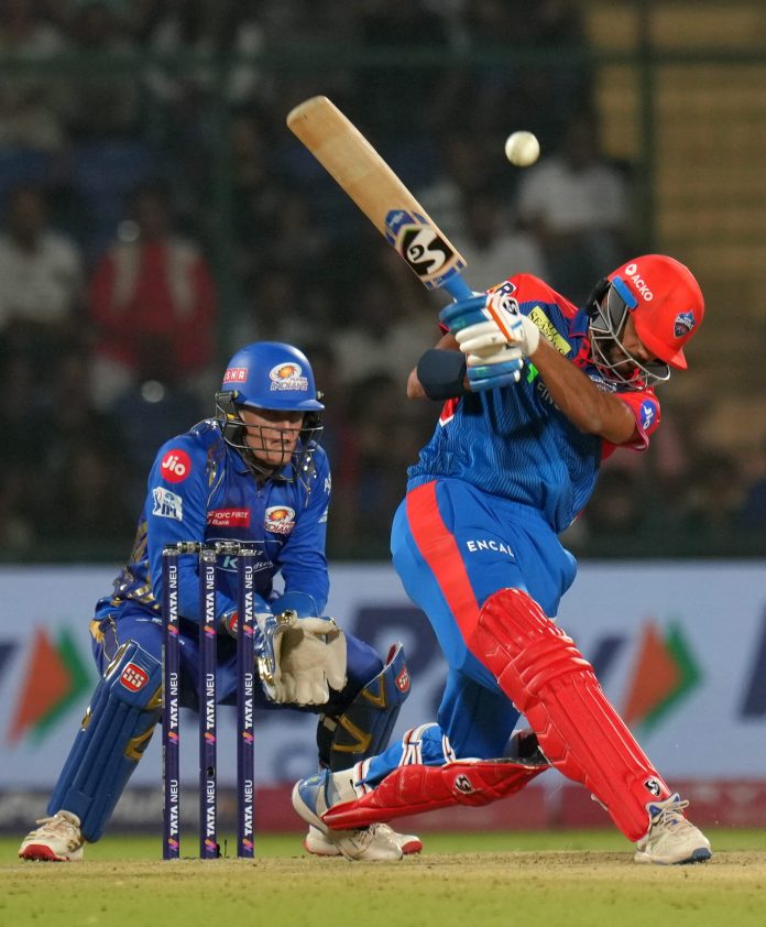 New Delhi: Delhi Capitals’ captain Axar Patel plays a shot during an Indian Premier League (IPL) 2025 T20 cricket match between Delhi Capitals and Mumbai Indians, at the Arun Jaitley Stadium, in New Delhi, Sunday, April 13, 2025. (PTI Photo/Shahbaz Khan) (PTI04_13_2025_000507B)
