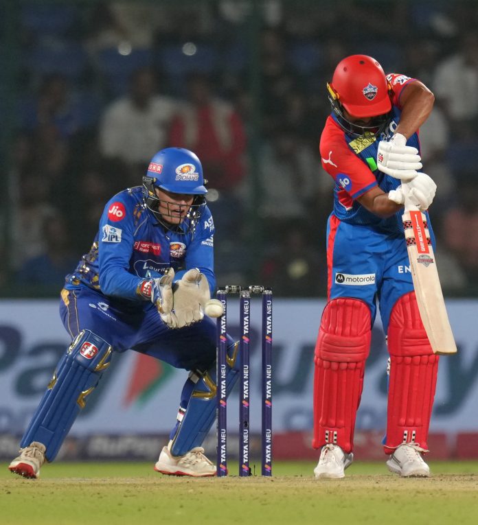 New Delhi: Delhi Capitals’ Karun Nair plays a shot during an Indian Premier League (IPL) 2025 T20 cricket match between Delhi Capitals and Mumbai Indians, at the Arun Jaitley Stadium, in New Delhi, Sunday, April 13, 2025. (PTI Photo/Shahbaz Khan) (PTI04_13_2025_000506B)