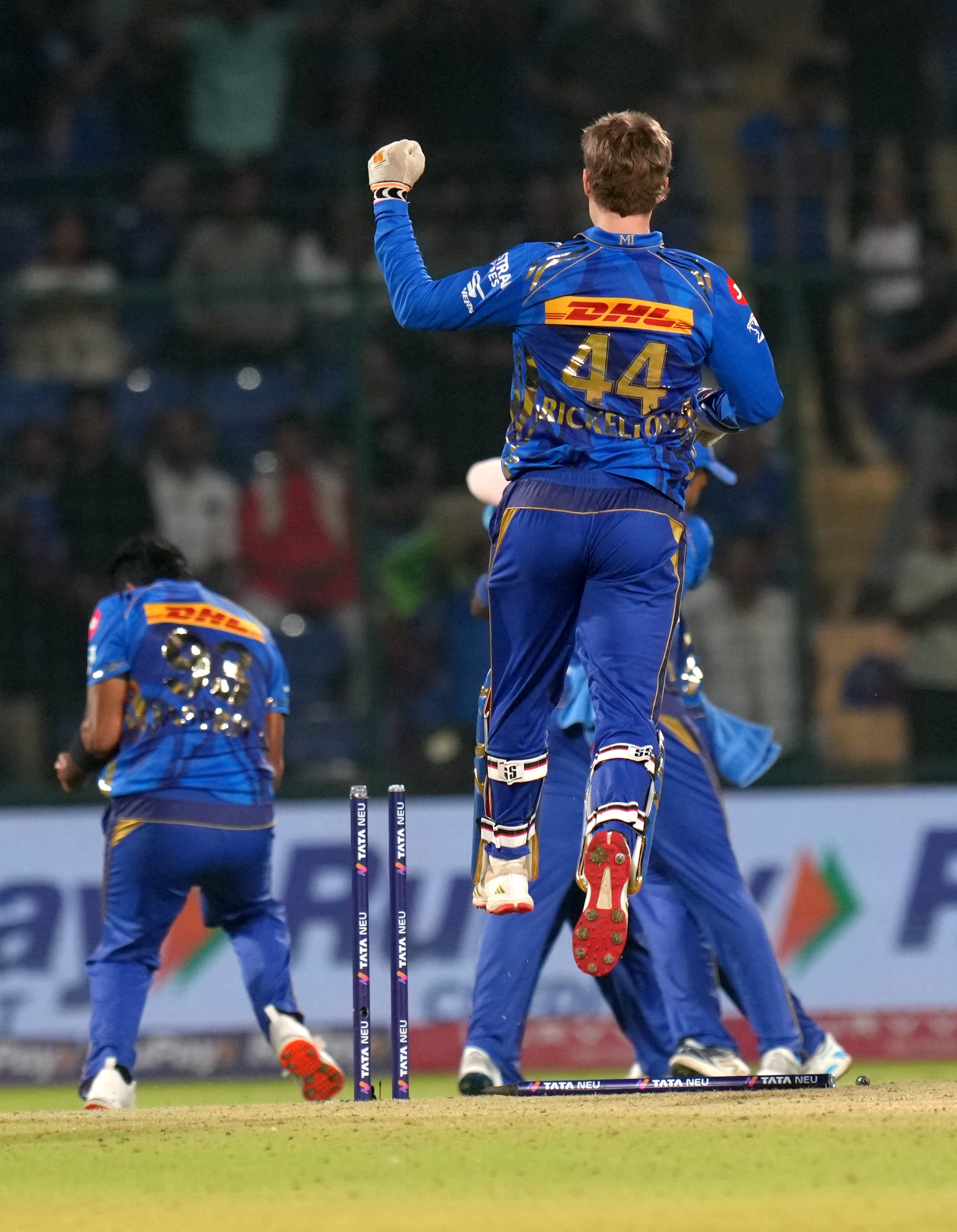 New Delhi: Mumbai Indians’ players celebrate after winning the Indian Premier League (IPL) 2025 T20 cricket match between Delhi Capitals and Mumbai Indians, at the Arun Jaitley Stadium, in New Delhi, Sunday, April 13, 2025. (PTI Photo/Shahbaz Khan) (PTI04_13_2025_000537B)