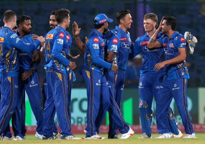 New Delhi: Mumbai Indians’ players celerbrate after winning the Indian Premier League (IPL) 2025 T20 cricket match between Delhi Capitals and Mumbai Indians, at the Arun Jaitley Stadium, in New Delhi, Sunday, April 13, 2025. (PTI Photo/Shahbaz Khan) (PTI04_13_2025_000532B)