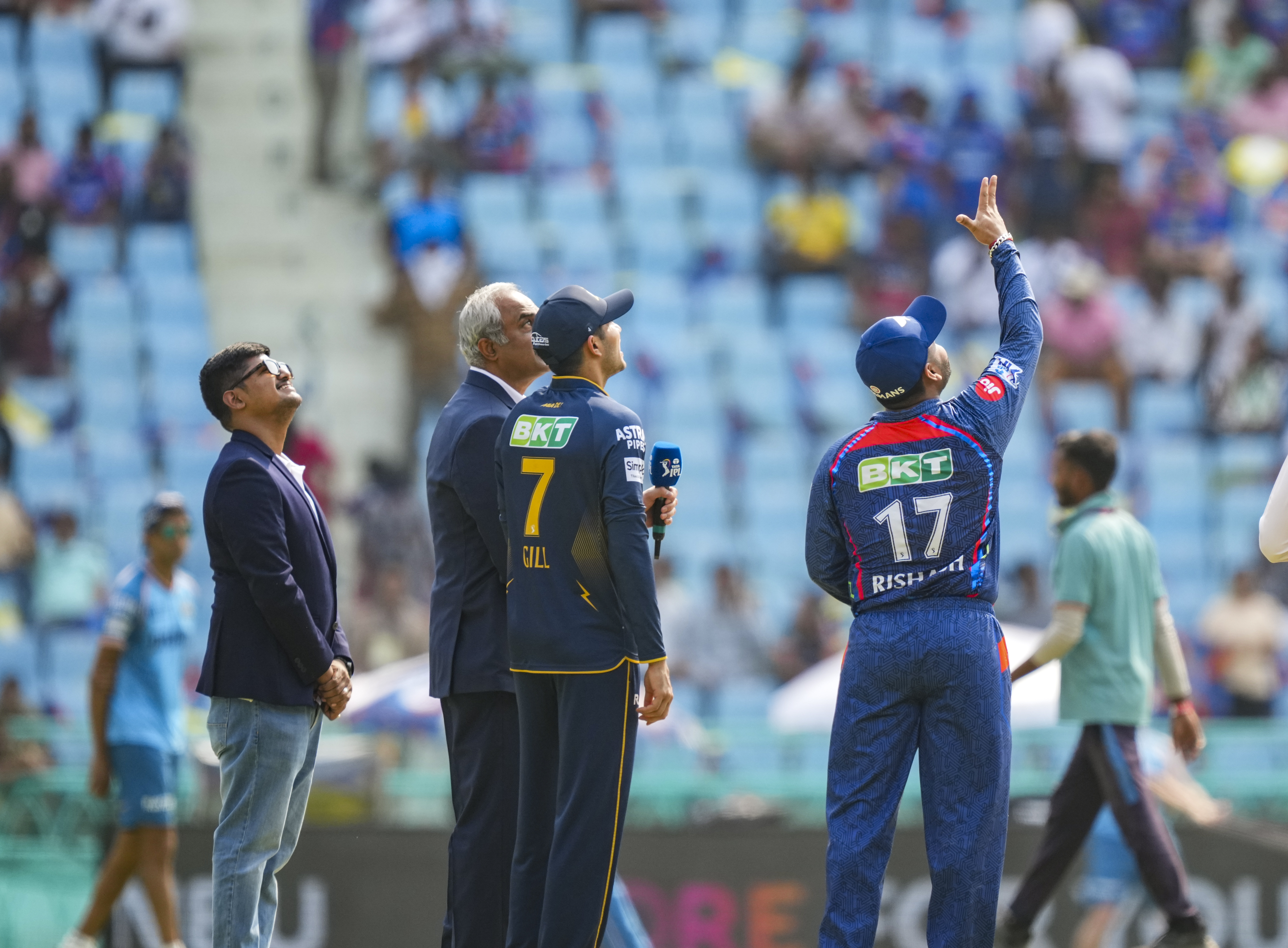 Lucknow: Gujarat Titans' captain Shubman Gill and Lucknow Super Giants' captain Rishabh Pant at the toss before the start of the Indian Premier League (IPL) 2025 cricket match between Lucknow Super Giants and Gujarat Titans, at Bharat Ratna Shri Atal Bihari Vajpayee Ekana Cricket Stadium, in Lucknow, Saturday, April 12, 2025. (PTI Photo/Atul Yadav)(PTI04_12_2025_000128B)