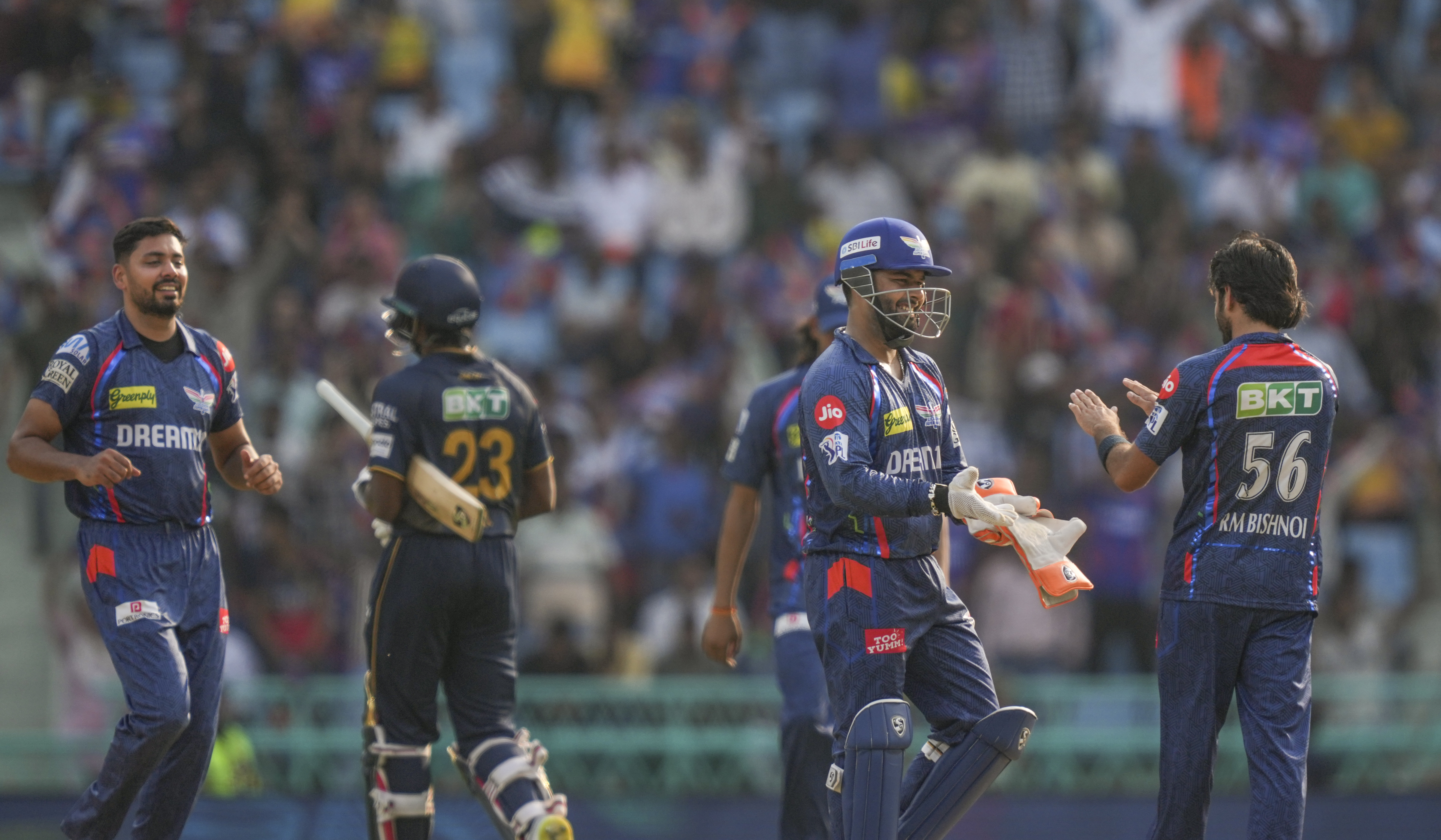 Lucknow: Lucknow Super Giants’ bowler Ravi Bishnoi celebrates with captain Rishabh Pant after the wicket of Gujarat Titans’ batter Sai Sudharsan during the Indian Premier League (IPL) 2025 match between Lucknow Super Giants and Gujarat Titans, at Bharat Ratna Shri Atal Bihari Vajpayee Ekana Cricket Stadium, in Lucknow, Saturday, April 12, 2025. (PTI Photo/Atul Yadav)(PTI04_12_2025_000204B)