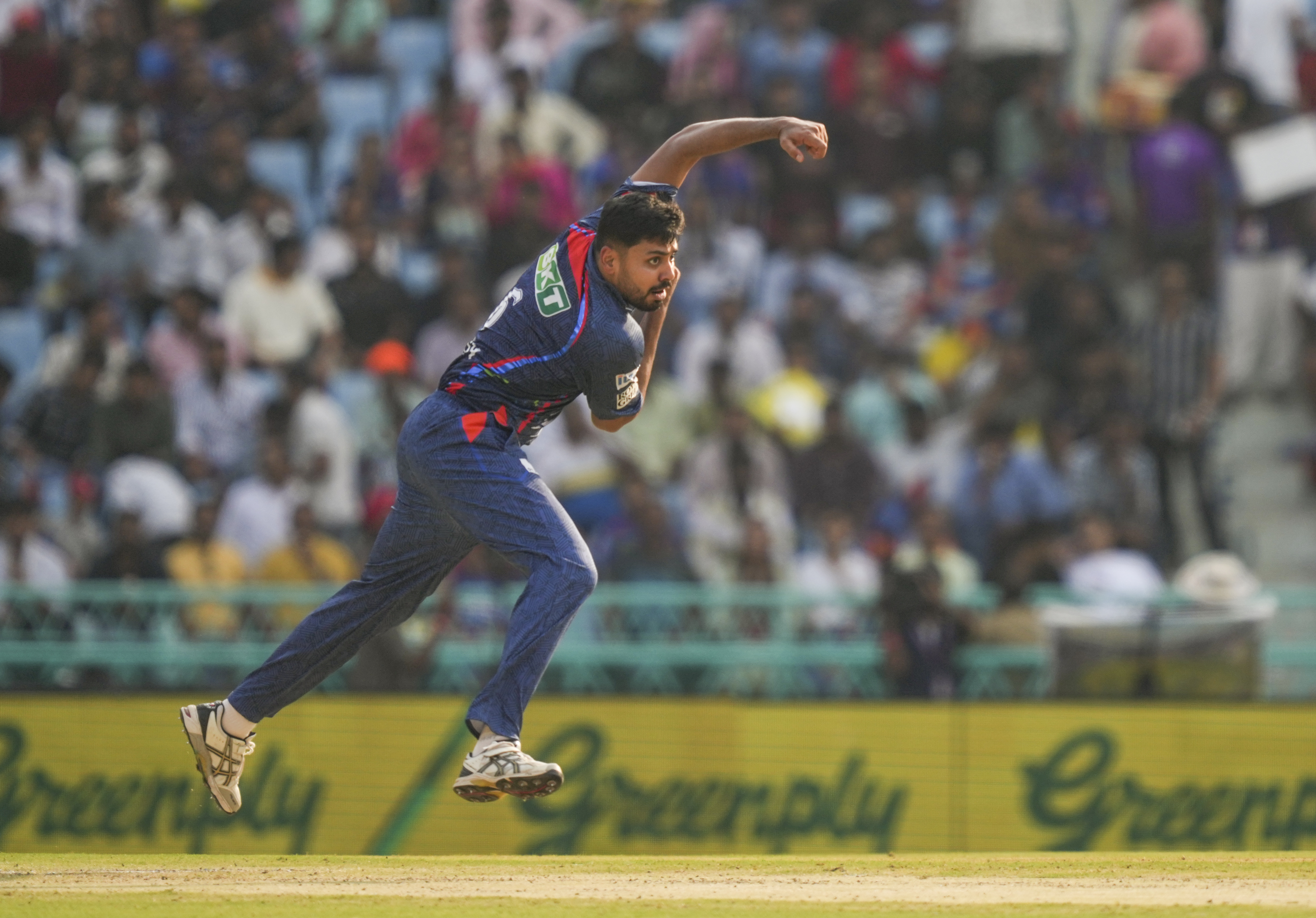 Lucknow: Lucknow Super Giants’ Avesh Khan bowls during the Indian Premier League (IPL) 2025 match between Lucknow Super Giants and Gujarat Titans, at Bharat Ratna Shri Atal Bihari Vajpayee Ekana Cricket Stadium, in Lucknow, Saturday, April 12, 2025. (PTI Photo/Atul Yadav)(PTI04_12_2025_000213B)
