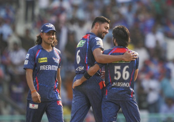Lucknow: Lucknow Super Giants’ bowler Ravi Bishnoi celebrates with teammate Avesh Khan after the wicket of Gujarat Titans’ batter Sai Sudharsan during the Indian Premier League (IPL) 2025 match between Lucknow Super Giants and Gujarat Titans, at Bharat Ratna Shri Atal Bihari Vajpayee Ekana Cricket Stadium, in Lucknow, Saturday, April 12, 2025. (PTI Photo/Atul Yadav)(PTI04_12_2025_000208B)