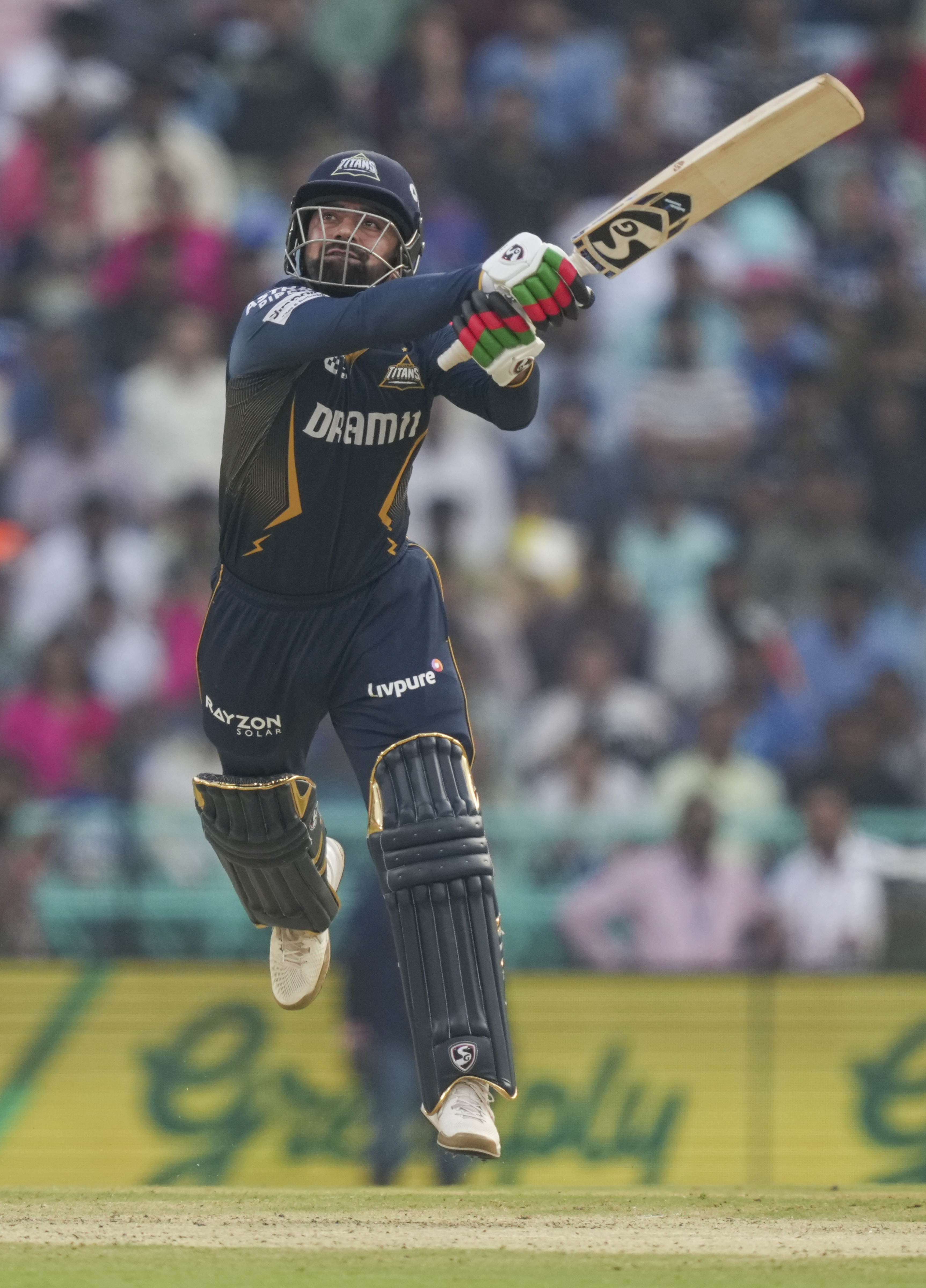 Lucknow: Gujarat Titans’ batter Rashid Khan plays a shot during the Indian Premier League (IPL) 2025 match between Lucknow Super Giants and Gujarat Titans, at Bharat Ratna Shri Atal Bihari Vajpayee Ekana Cricket Stadium, in Lucknow, Saturday, April 12, 2025. (PTI Photo/Atul Yadav)(PTI04_12_2025_000268B)