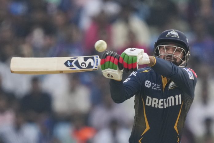 Lucknow: Gujarat Titans’ batter Rashid Khan plays a shot during the Indian Premier League (IPL) 2025 match between Lucknow Super Giants and Gujarat Titans, at Bharat Ratna Shri Atal Bihari Vajpayee Ekana Cricket Stadium, in Lucknow, Saturday, April 12, 2025. (PTI Photo/Atul Yadav)(PTI04_12_2025_000260B)