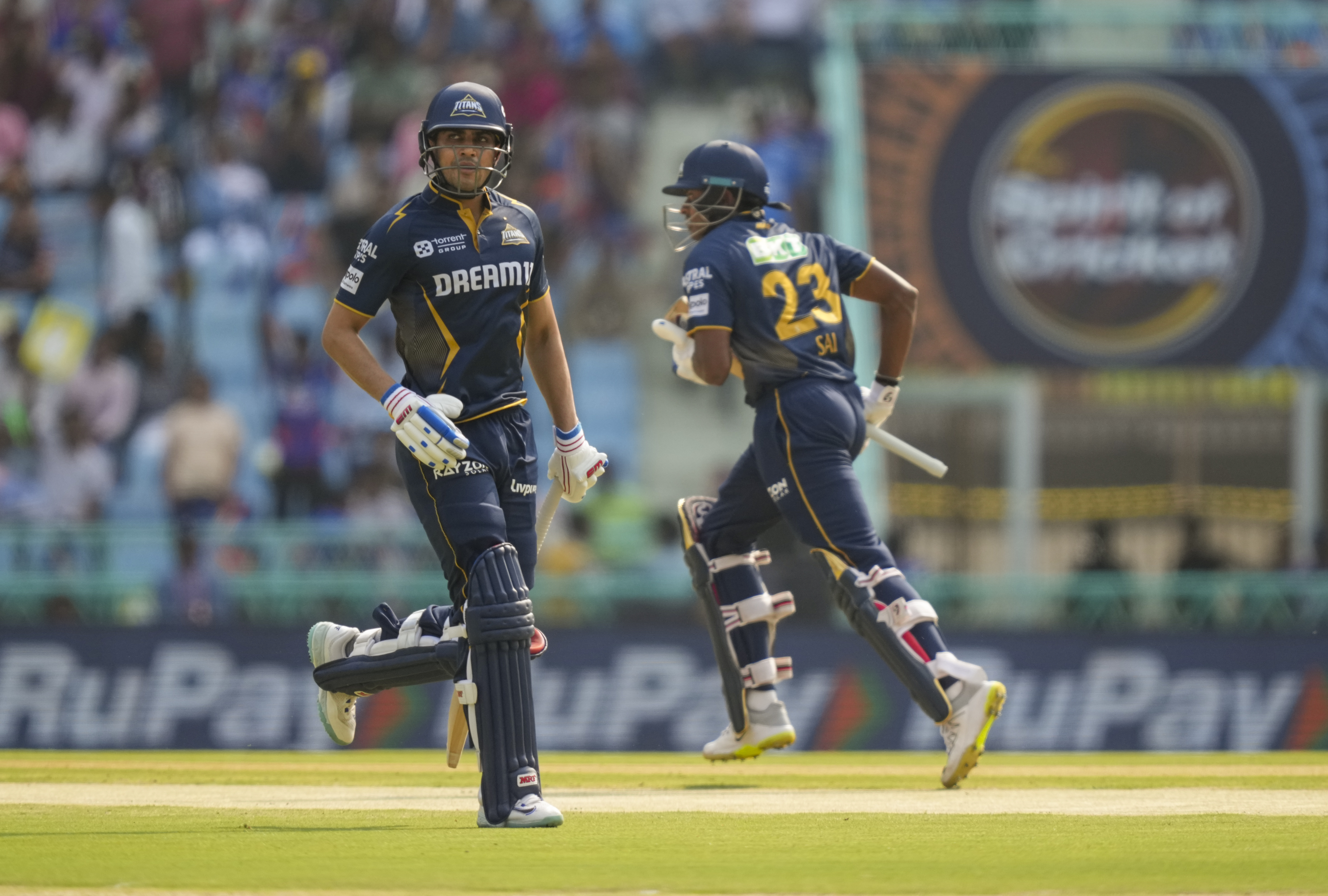Lucknow: Gujarat Titans’ batters Shubman Gill and Sai Sudharsan run between the wickets during the Indian Premier League (IPL) 2025 cricket match between Lucknow Super Giants and Gujarat Titans, at Bharat Ratna Shri Atal Bihari Vajpayee Ekana Cricket Stadium, in Lucknow, Saturday, April 12, 2025. (PTI Photo/Atul Yadav)(PTI04_12_2025_000143B)