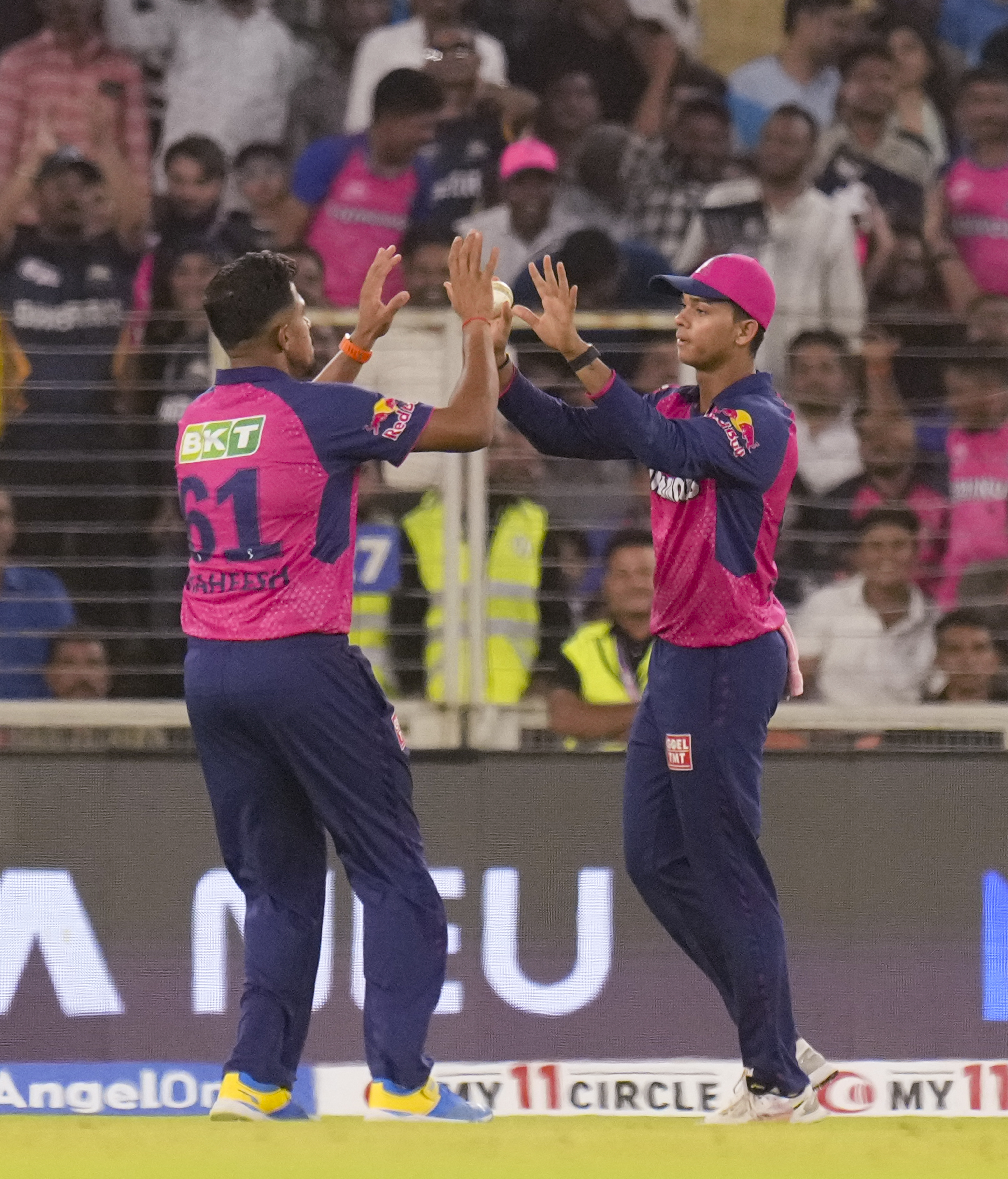 Ahmedabad: Rajasthan Royals’ Yashasvi Jaiswal celebrates with Maheesh Theekshana after taking the catch of Gujarat Titans’ Rashid Khan during an Indian Premier League (IPL) 2025 T20 cricket match between Gujarat Titans and Rajasthan Royals, at the Narendra Modi Stadium, in Ahmedabad, Wednesday, April 9, 2025. (PTI Photo/Arun Sharma) (PTI04_09_2025_000498B)
