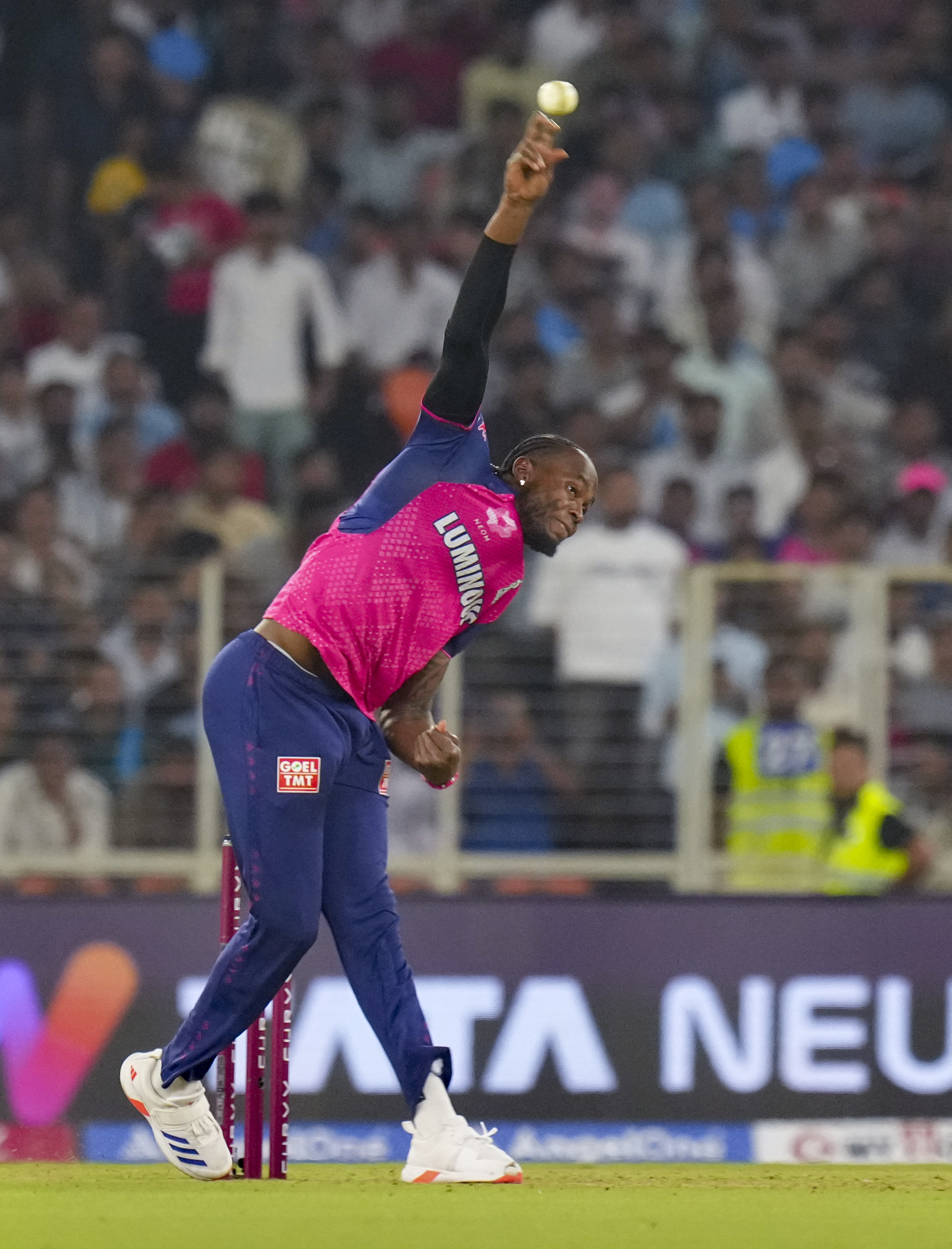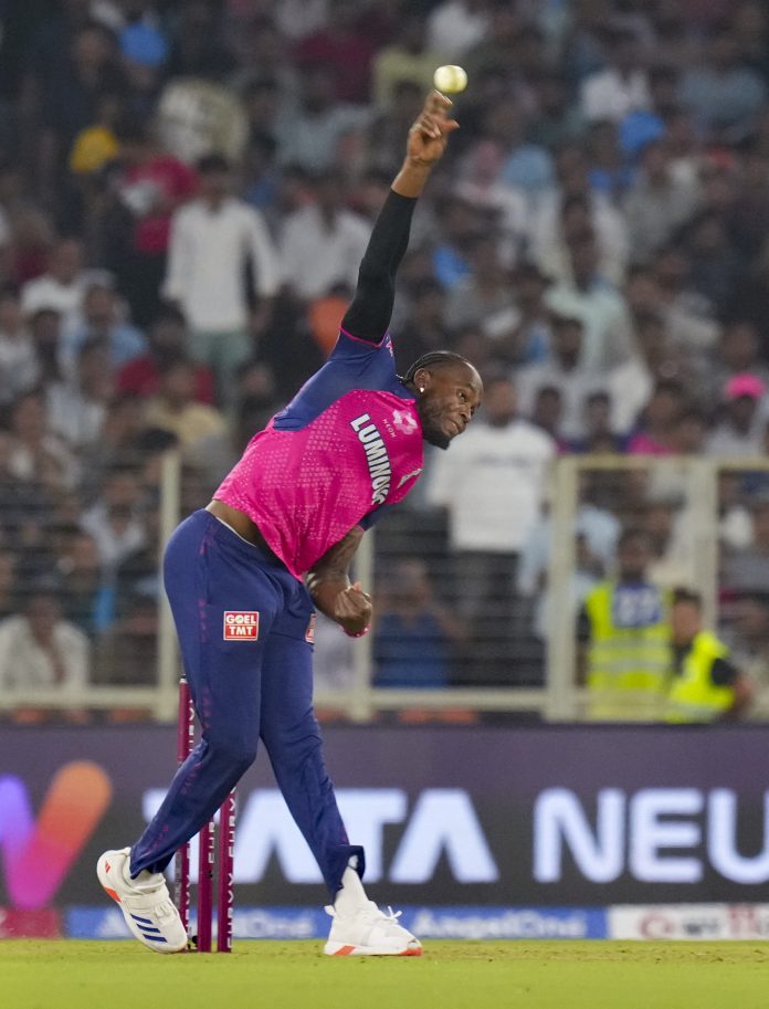 Ahmedabad: Rajasthan Royals’ Jofra Archer bowls a delivery during an Indian Premier League (IPL) 2025 T20 cricket match between Gujarat Titans and Rajasthan Royals, at the Narendra Modi Stadium, in Ahmedabad, Wednesday, April 9, 2025. (PTI Photo/Arun Sharma) (PTI04_09_2025_000491B)
