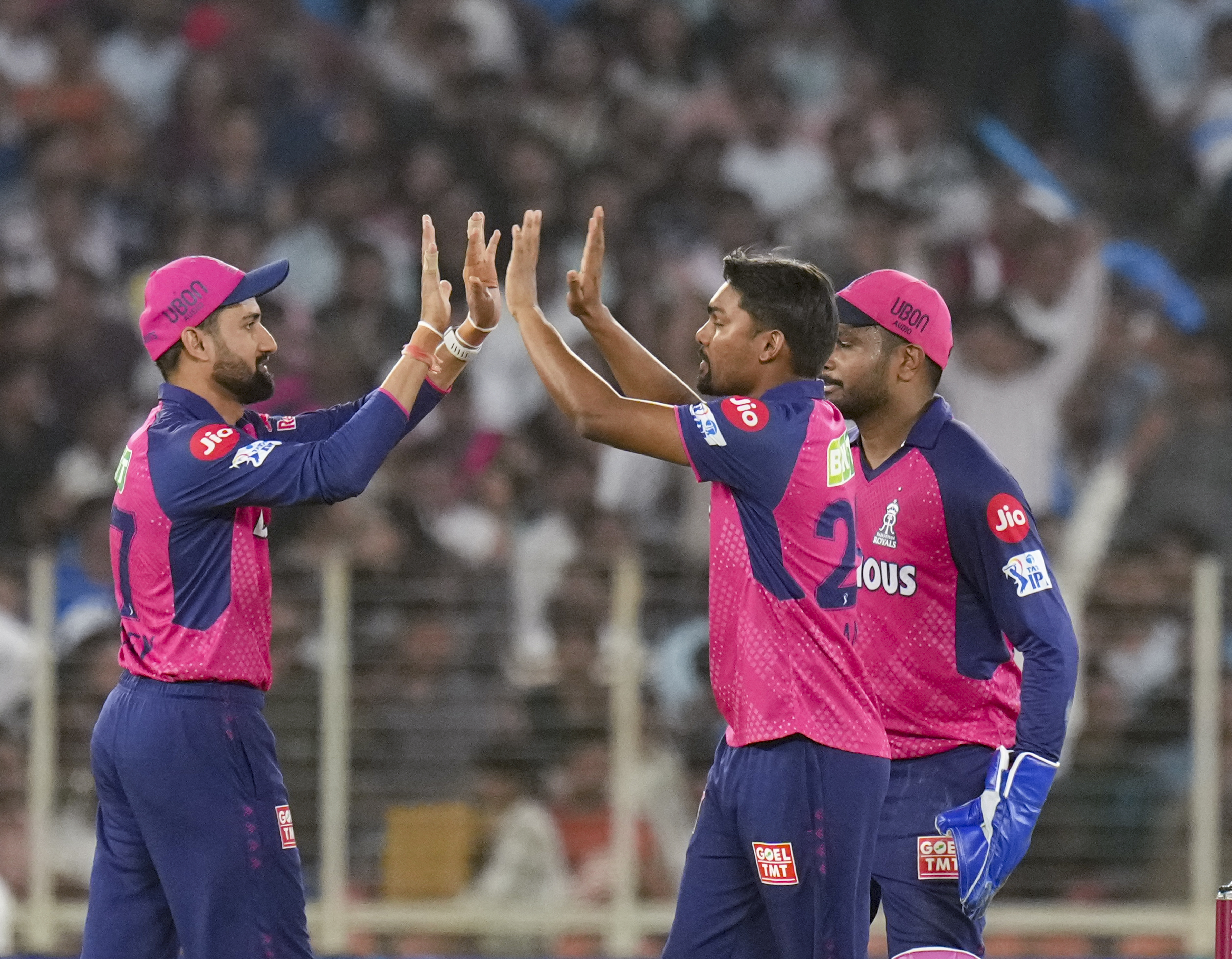 Ahmedabad: Rajasthan Royals’ Sandeep Sharma celebrates with teammates after taking the wicket of Gujarat Titans’ Sherfane Rutherford during an Indian Premier League (IPL) 2025 T20 cricket match between Gujarat Titans and Rajasthan Royals, at the Narendra Modi Stadium, in Ahmedabad, Wednesday, April 9, 2025. (PTI Photo/Arun Sharma) (PTI04_09_2025_000486B)
