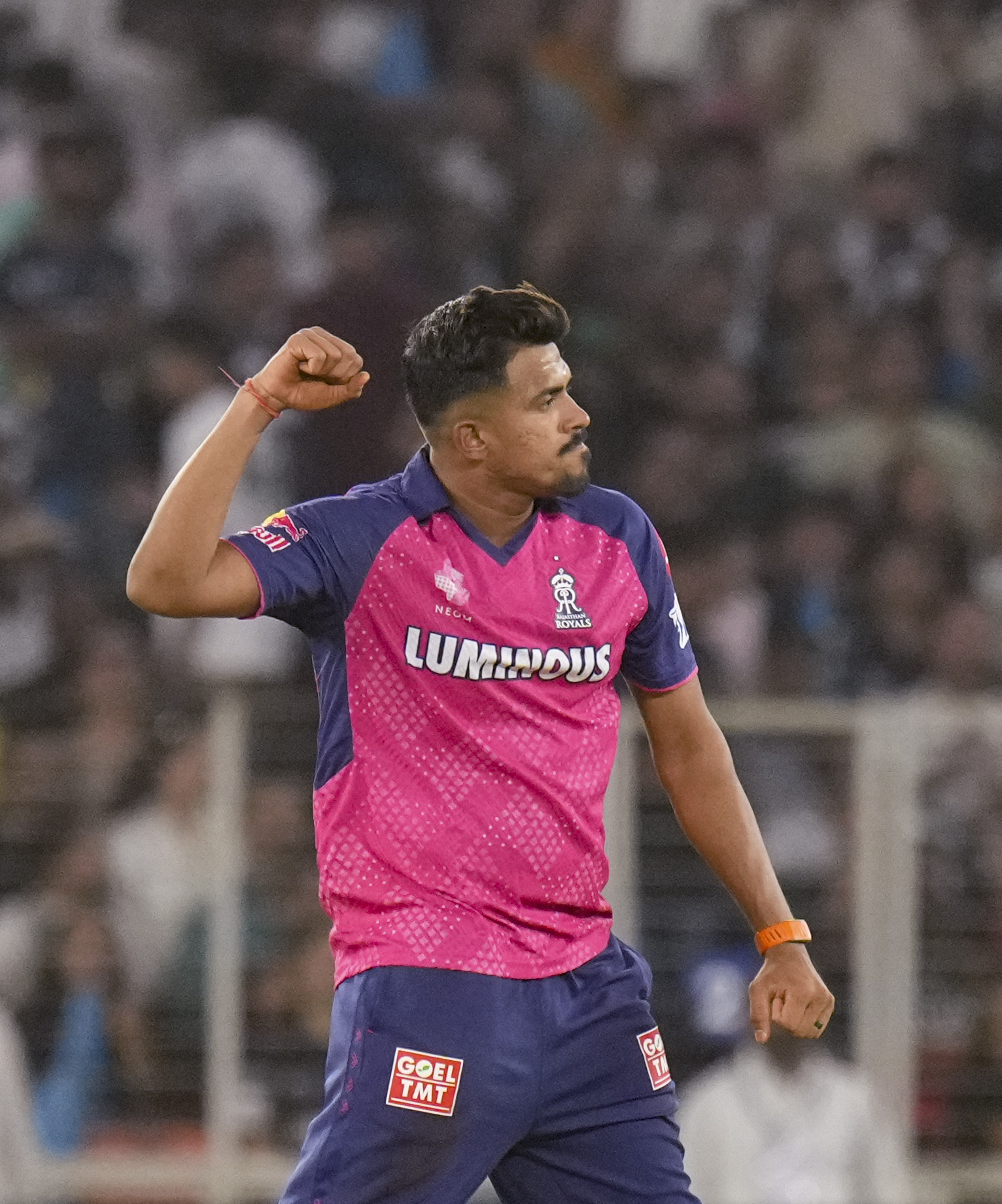 Ahmedabad: Rajasthan Royals’ Maheesh Theekshana celebrates the wicket of Gujarat Titans� M Shahrukh Khan during an Indian Premier League (IPL) 2025 T20 cricket match between Gujarat Titans and Rajasthan Royals, at the Narendra Modi Stadium, in Ahmedabad, Wednesday, April 9, 2025. (PTI Photo/Arun Sharma) (PTI04_09_2025_000481B)