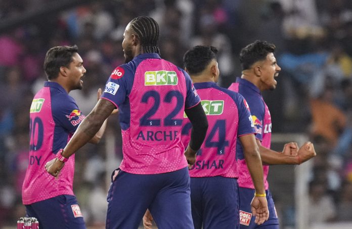 Ahmedabad: Rajasthan Royals’ Maheesh Theekshana celebrates with teammates after taking the wicket of Gujarat Titans� Jos Buttler during an Indian Premier League (IPL) 2025 T20 cricket match between Gujarat Titans and Rajasthan Royals, at the Narendra Modi Stadium, in Ahmedabad, Wednesday, April 9, 2025. (PTI Photo/Arun Sharma) (PTI04_09_2025_000453B)