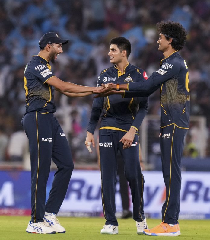 Ahmedabad: Gujarat Titans’ Sai Kishore celebrates with teammates after taking the wicket of Rajasthan Royals� Tushar Deshpande during an Indian Premier League (IPL) 2025 T20 cricket match between Gujarat Titans and Rajasthan Royals, at the Narendra Modi Stadium, in Ahmedabad, Wednesday, April 9, 2025. (PTI Photo/Arun Sharma) (PTI04_09_2025_000613B)