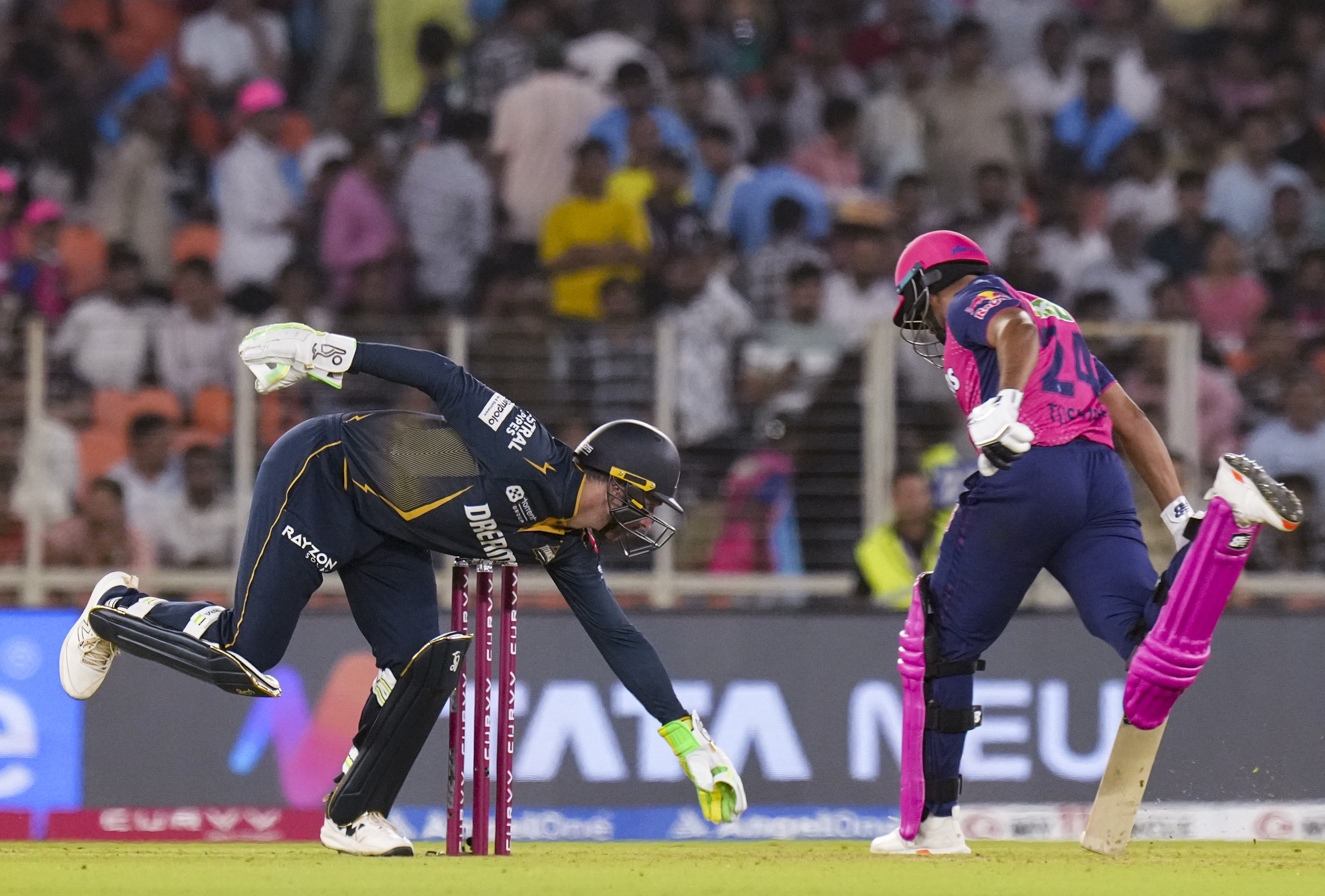 Ahmedabad: Rajasthan Royals� Tushar Deshpande safely reaches the crease during an Indian Premier League (IPL) 2025 T20 cricket match between Gujarat Titans and Rajasthan Royals, at the Narendra Modi Stadium, in Ahmedabad, Wednesday, April 9, 2025. (PTI Photo/Arun Sharma) (PTI04_09_2025_000606B)